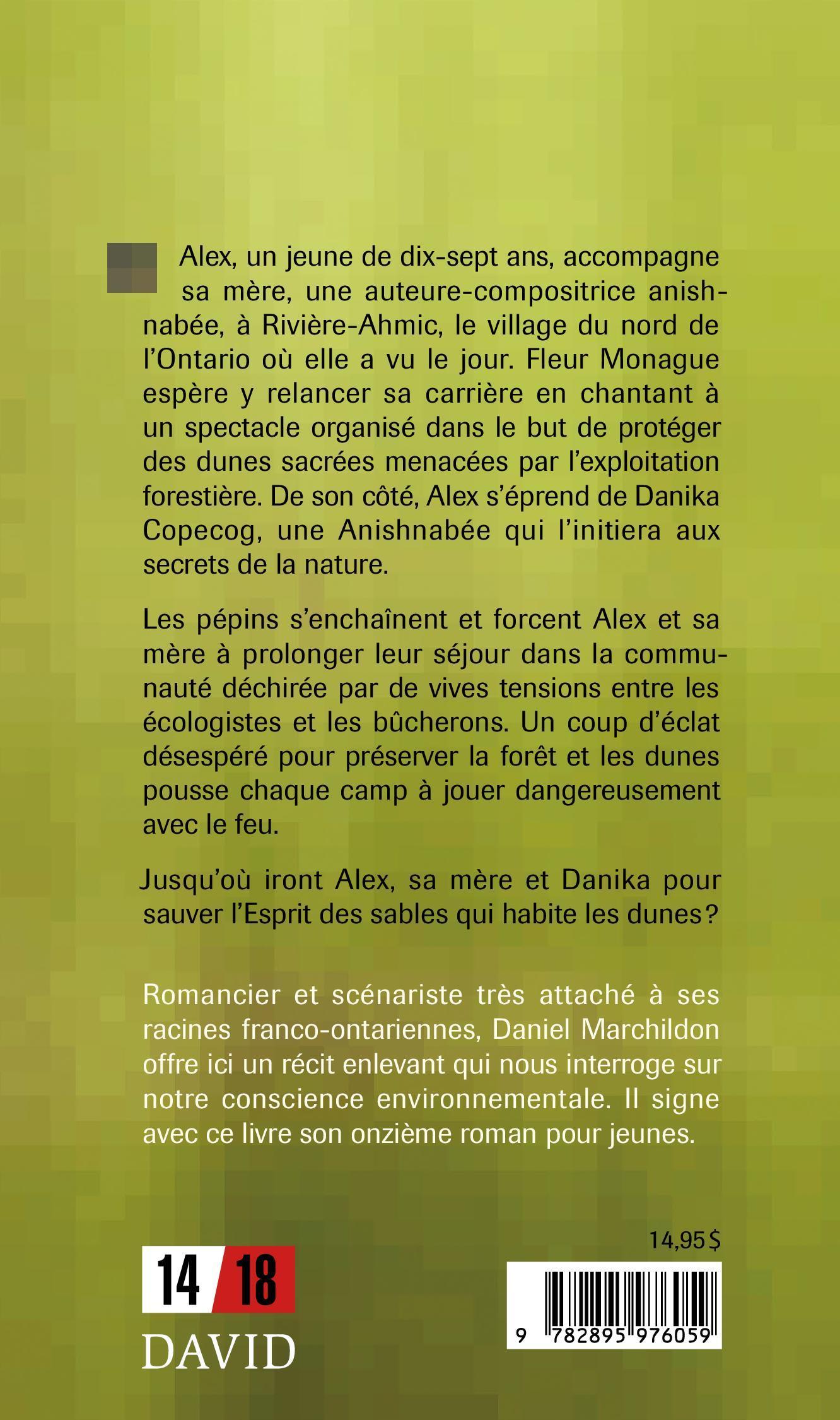 Alex, un jeune de dix-sept ans, accompagne sa mère, Fleur Monague, une auteure-compositrice anishnabée, à Rivière-Ahmic, le village du nord de l’Ontario où elle a vu le jour. Fleur espère y relancer sa carrière en participant à un spectacle organisé par un groupe écologiste qui lutte pour protéger des dunes sacrées menacées par l’exploitation forestière. De son côté, Alex rencontrera Danika Copecog, une Anishnabée qui l’initiera aux secrets de la nature.Les événements prennent une tournure inattendue. Malgré eux, Alex et sa mère prolongent leur séjour dans la communauté déchirée par de vives tensions entre les écologistes et les bûcherons. En réaction à un coup d’éclat désespéré pour préserver la forêt des tronçonneuses, chaque camp se met à jouer dangereusement avec le feu.Jusqu’où iront Alex, sa mère et Danika pour sauver la forêt?Romancier et scénariste très attaché à ses racines ontariennes, Daniel Marchildon offre ici un récit enlevant qui nous interroge sur notre conscience environnementale et notre ouverture aux autres cultures.