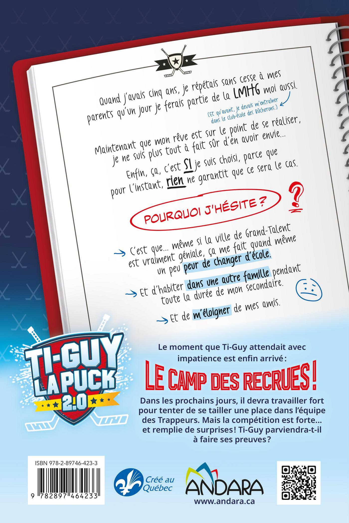 Quand j’avais cinq ans, je répétais sans cesse à mes parents qu’un jour je ferais partie de la LMHG moi aussi.Maintenant que mon rêve est sur le point de se réaliser, je ne suis plus tout à fait sûr d’en avoir envie…Enfin, ça, c’est SI je suis choisi, parce que pour l’instant, rien ne garantit que ce sera le cas.POURQUOI J’HÉSITE?C’est que… même si la ville de Grand-Talent est vraiment géniale, ça me fait quand même un peu peur de changer d’école .Et d’habiter dans une autre famille pendant toute la durée de mon secondaire.Et de m’éloigner de mes amis.Le moment que Ti-Guy attendait avec impatience est enfin arrivé : LE CAMPS DES RECRUES !