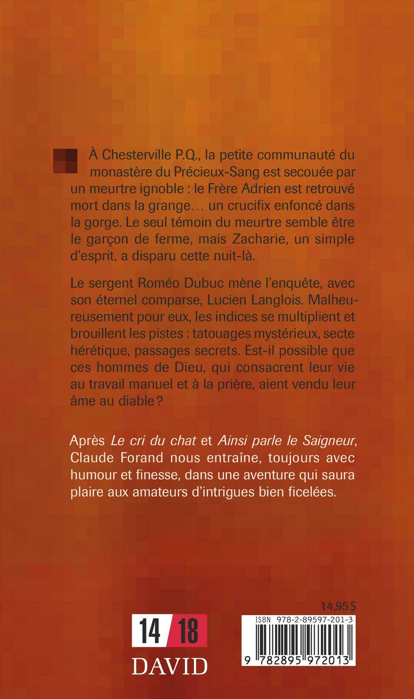 À Chesterville P.Q., la petite communauté du monastère du Précieux-Sang est secouée par un meurtre ignoble : le Frère Adrien est retrouvé mort dans la grange… un crucifix enfoncé dans la gorge. Le seul témoin du meurtre semble être le garçon de ferme, mais Zacharie, un simple d’esprit, a disparu cette nuit-là. Le sergent Roméo Dubuc mène l’enquête, avec son éternel comparse, Lucien Langlois. Malheureusement pour eux, les indices se multiplient et brouillent les pistes : tatouages mystérieux, secte hérétique, passages secrets. Est-il possible que ces hommes de Dieu, qui consacrent leur vie au travail manuel et à la prière, aient vendu leur âme au diable ? Après Le cri du chat et Ainsi parle le Saigneur, Claude Forand nous entraîne, toujours avec humour et finesse, dans une aventure qui saura plaire aux amateurs d’intrigues bien ficelées.