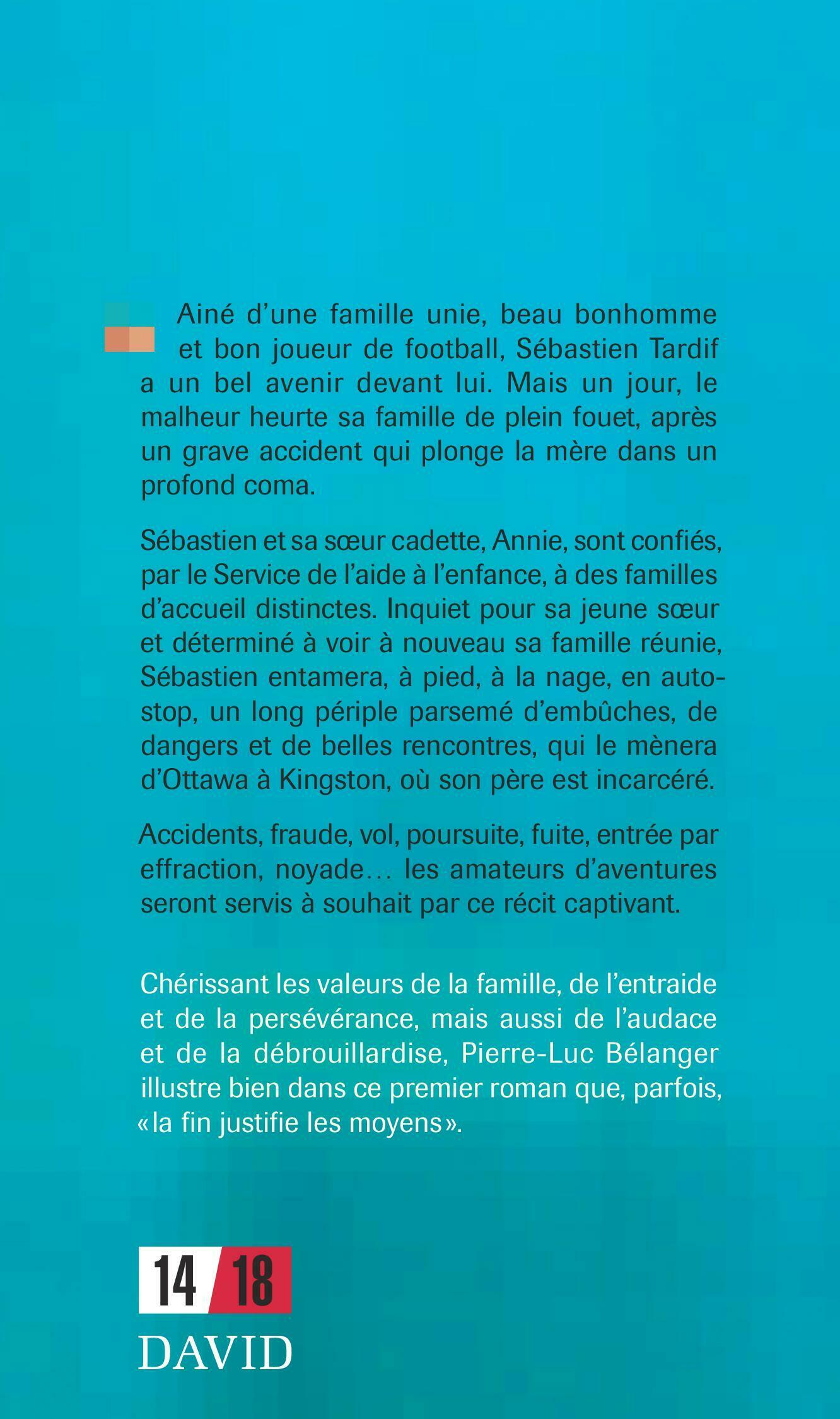 Ainé d’une famille unie, beau bonhomme et bon joueur de football, Sébastien Tardif a un bel avenir devant lui. Mais un jour, le malheur heurte sa famille de plein fouet, après un grave accident qui plonge la mère dans un profond coma. Sébastien et sa sœur cadette, Annie, sont confiés, par le Service de l’aide à l’enfance, à des familles d’accueil distinctes. Inquiet pour sa jeune sœur et déterminé à voir à nouveau sa famille réunie, Sébastien entamera, à pied, à la nage, en auto-stop, un long périple parsemé d’embûches, de dangers et de belles rencontres, qui le mènera d’Ottawa à Kingston, où son père est incarcéré. Accidents, fraude, vol, poursuite, fuite, entrée par effraction, noyade… les amateurs d’aventures seront servis à souhait par ce récit captivant.Chérissant les valeurs de la famille, de l’entraide et de la persévérance, mais aussi de l'audace et de la débrouillardise, Pierre-Luc Bélanger illustre bien dans ce premier roman que, parfois, «la fin justifie les moyens».