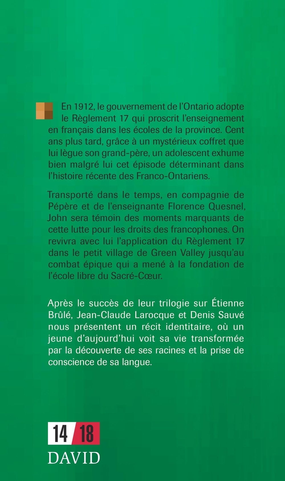 En 1912, le gouvernement de l’Ontario adopte le Règlement 17 qui proscrit l’enseignement en français dans les écoles de la province. Cent ans plus tard, grâce à un mystérieux coffret que lui lègue son grand-père, un adolescent exhume bien malgré lui cet épisode déterminant dans l’histoire récente des Franco-Ontariens. Transporté dans le temps, en compagnie de Pépère et de l’enseignante Florence Quesnel, John sera témoin des moments marquants de cette lutte pour les droits des francophones. On revivra avec lui l’application du Règlement 17 dans le petit village de Green Valley jusqu’au combat épique qui a mené à la fondation de l’école libre du Sacré-Cœur.Après le succès de leur trilogie sur Étienne Brûlé, Jean-Claude Larocque et Denis Sauvé nous présentent un récit identitaire, où un jeune d’aujourd’hui voit sa vie transformée par la découverte de ses racines et la prise de conscience de sa langue.
