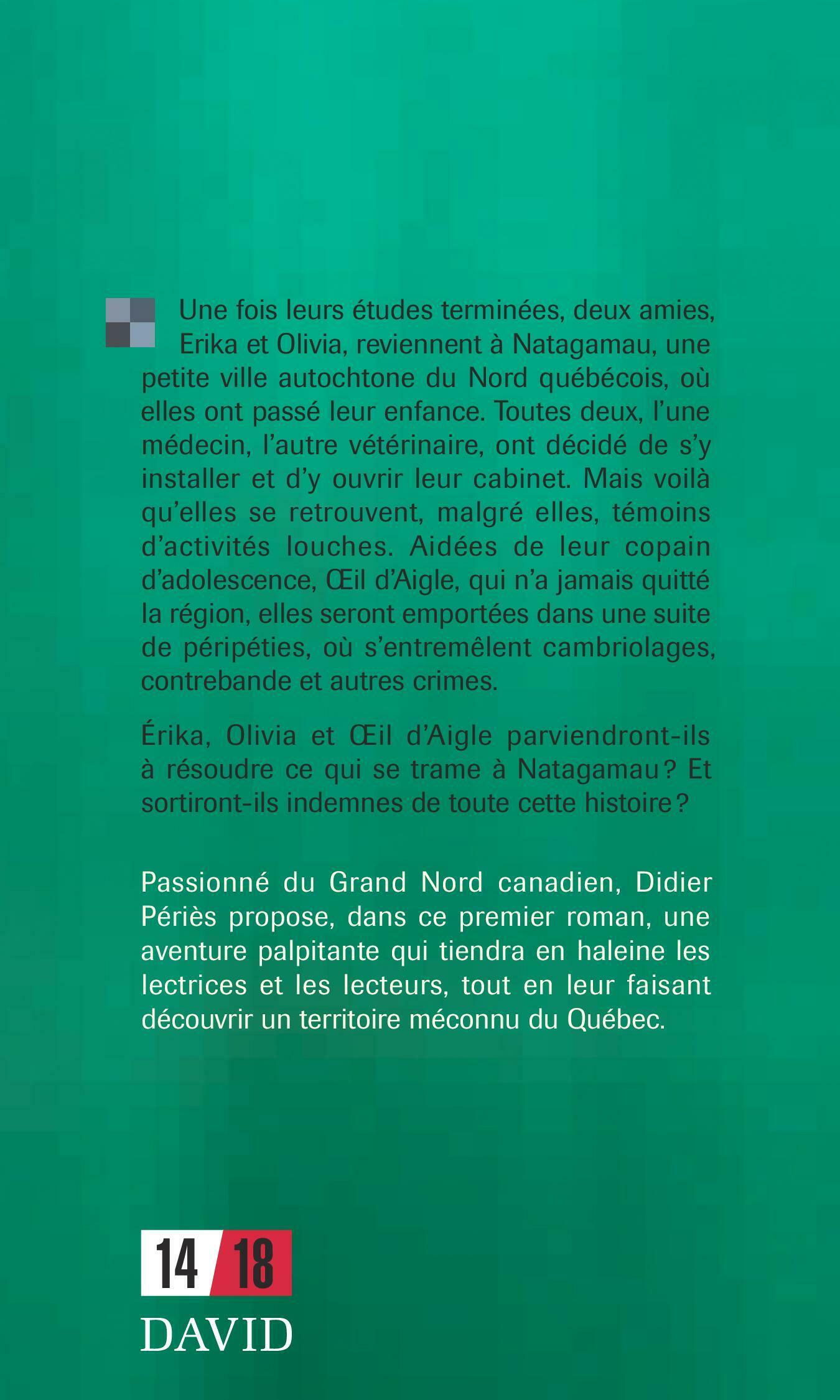 Une fois leurs études terminées, deux amies, Erika et Olivia, reviennent à Natagamau, une petite ville autochtone du Nord québécois, où elles ont passé leur enfance. Toutes deux, l’une médecin, l’autre vétérinaire, ont décidé de s’y installer et d’y ouvrir leur cabinet. Mais voilà qu’elles se retrouvent, malgré elles, témoins d’activités louches. Aidées de leur copain d’adolescence, Œil d’Aigle, qui n’a jamais quitté la région, elles seront emportées dans une suite de péripéties, où s’entremêlent cambriolages, contrebande et autres crimes. Érika, Olivia et Œil d’Aigle parviendront-ils à résoudre ce qui se trame à Natagamau? Et sortiront-ils indemnes de toute cette histoire?Passionné du Grand Nord canadien, Didier Périès propose, dans ce premier roman, une aventure palpitante qui tiendra en haleine les lectrices et les lecteurs, tout en leur faisant découvrir un territoire méconnu du Québec.
