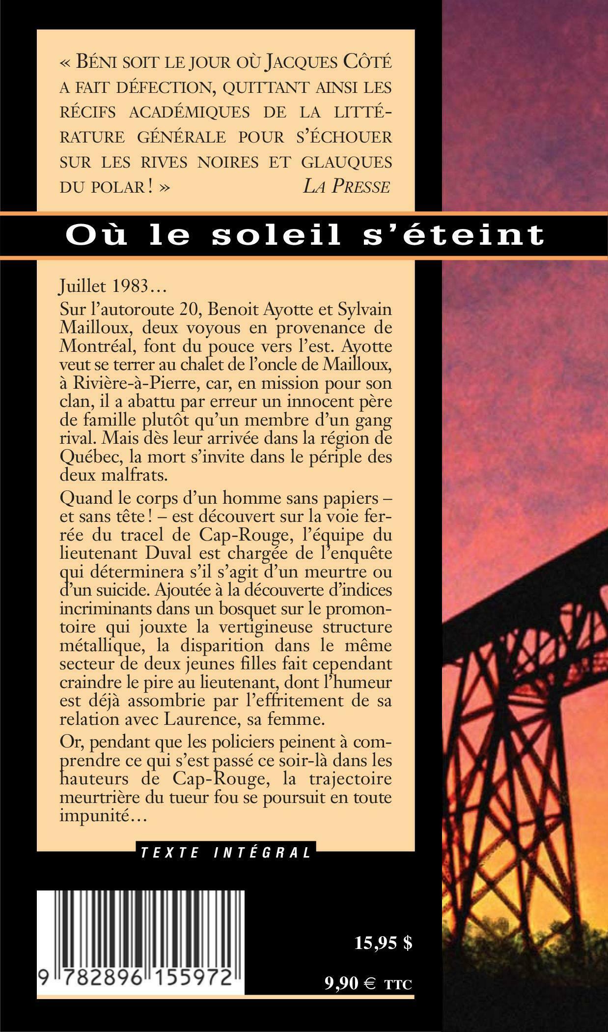 Juillet 1983…Sur l’autoroute 20, Benoit Ayotte et Sylvain Mailloux, deux voyous en provenance de Montréal, font du pouce vers l’est. Ayotte veut se terrer au chalet de l’oncle de Mailloux, à Rivière-à-Pierre, car, en mission pour son clan, il a abattu par erreur un innocent père de famille plutôt qu’un membre d’un gang rival. Mais dès leur arrivée dans la région de Québec, la mort s’invite dans le périple des deux malfrats.Quand le corps d’un homme sans papiers – et sans tête ! – est découvert sur la voie ferrée du tracel de Cap-Rouge, l’équipe du lieutenant Duval est chargée de l’enquête qui déterminera s’il s’agit d’un meurtre ou d’un suicide. Ajoutée à la découverte d’indices incriminants dans un bosquet sur le promontoire qui jouxte la vertigineuse structure métallique, la disparition dans le même secteur de deux jeunes filles fait cependant craindre le pire au lieutenant, dont l’humeur est déjà assombrie par l’effritement de sa relation avec Laurence, sa femme.Or, pendant que les policiers peinent à comprendre ce qui s’est passé ce soir-là dans les hauteurs de Cap-Rouge, la trajectoire meurtrière du tueur fou se poursuit en toute impunité…