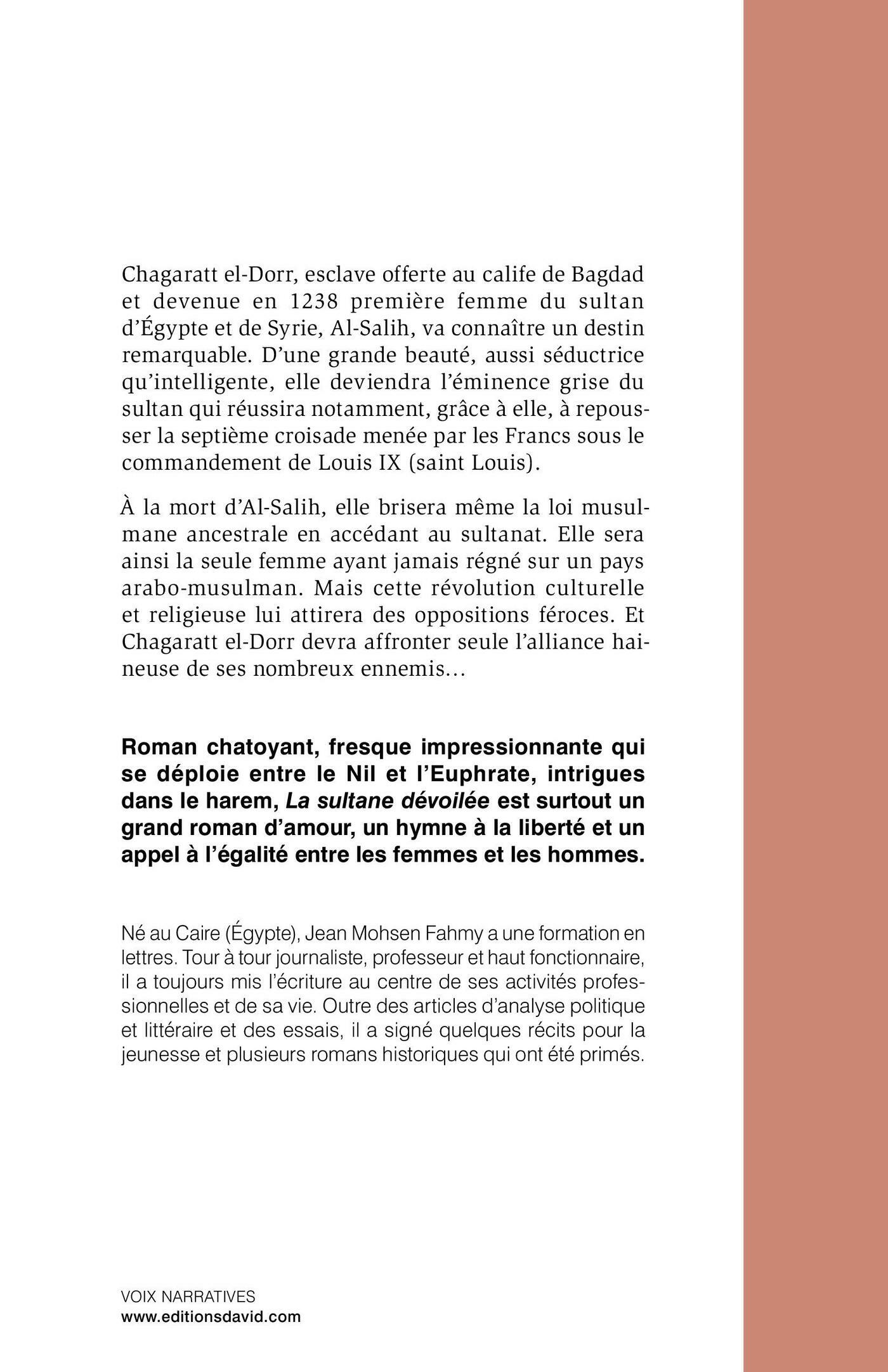 Chagaratt el-Dorr, esclave offerte au calife de Bagdad et devenue en 1238 première femme du sultan d’Égypte et de Syrie, Al-Salih, va connaître un destin remarquable. D’une grande beauté, aussi séductrice qu’intelligente, elle deviendra l’éminence grise du sultan qui réussira notamment, grâce à elle, à repousser la septième croisade menée par les Francs sous le commandement de Louis IX (saint Louis). À la mort d’Al-Salih, elle brisera même la loi musulmane ancestrale en accédant au sultanat. Elle sera ainsi la seule femme ayant jamais régné sur un pays arabo-musulman. Mais cette révolution culturelle et religieuse lui attirera des oppositions féroces. Et Chagaratt el-Dorr devra affronter seule l’alliance haineuse de ses nombreux ennemis…Roman chatoyant, fresque impressionnante qui se déploie entre le Nil et l’Euphrate, intrigues dans le harem, La sultane dévoilée est surtout un grand roman d’amour, un hymne à la liberté et un appel à l’égalité entre les femmes et les hommes.
