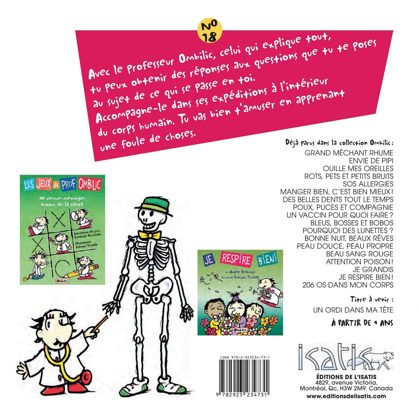 Pour ce 18e album de la collection Ombilic,les os sont mis à l’honneur. Avec sa simplicité légendaire, le prof Ombilic explique aux enfants tout ce qu’ils doivent savoir sur les os qui structurent leur corps. Avec des comparaisons justes et pertinentes et des références familièresà leur univers, le gentil guide leur expliquece qui se passe dans leur corps. Au fil despages, les jeunes lecteurs apprendrontde quoi se composent les os, comment est constitué notre squelette et comment le tout s’articule à l’aide des muscles et des nerfs. De quoi nourrir la curiosité de bien des petits curieux.