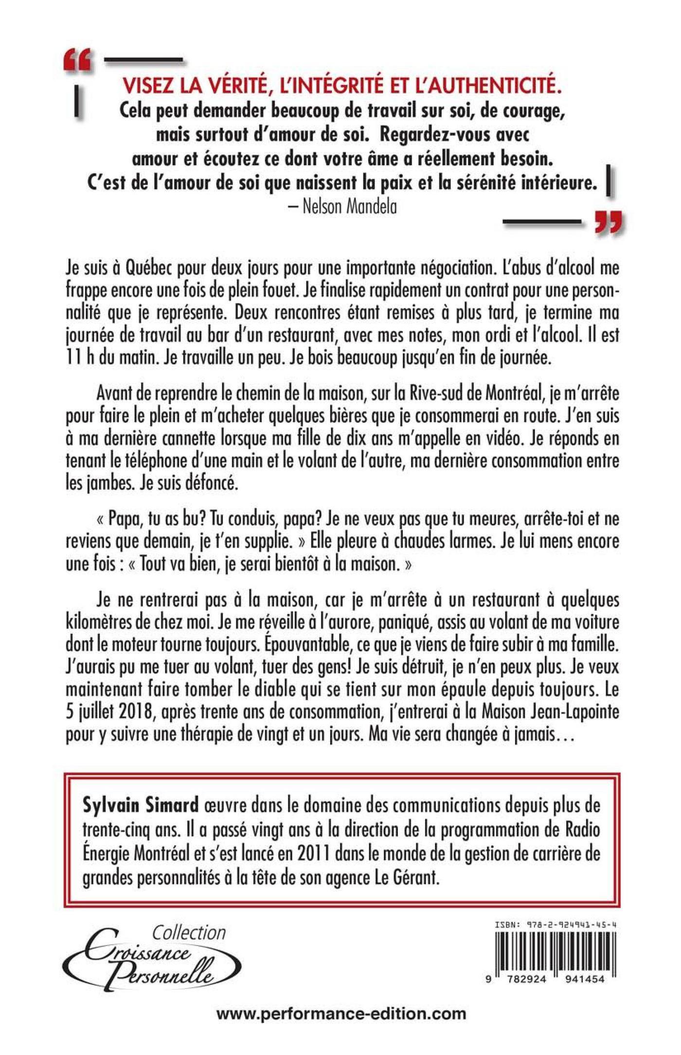 Je suis à Québec pour deux jours pour une importante négociation. L’abus d’alcool me frappe encore une fois de plein fouet. Je finalise rapidement un contrat pour une person- nalité que je représente. Deux rencontres étant remises à plus tard, je termine ma journée de travail au bar d’un restaurant, avec mes notes, mon ordi et l’alcool. Il est 11 h du matin. Je travaille un peu. Je bois beaucoup jusqu’en fin de journée.Avant de reprendre le chemin de la maison, sur la Rive-sud de Montréal, je m’arrête pour faire le plein et m’acheter quelques bières que je consommerai en route. J’en suis à ma dernière cannette lorsque ma fille de dix ans m’appelle en vidéo. Je réponds en tenant le téléphone d’une main et le volant de l’autre, ma dernière consommation entre les jambes. Je suis défoncé.« Papa, tu as bu? Tu conduis, papa? Je ne veux pas que tu meures, arrête-toi et ne reviens que demain, je t’en supplie. » Elle pleure à chaudes larmes. Je lui mens encore une fois : « Tout va bien, je serai bientôt à la maison. »Je ne rentrerai pas à la maison, car je m’arrête à un restaurant à quelques kilomètres de chez moi. Je me réveille à l’aurore, paniqué, assis au volant de ma voiture dont le moteur tourne toujours. Épouvantable, ce que je viens de faire subir à ma famille. J’aurais pu me tuer au volant, tuer des gens! Je suis détruit, je n’en peux plus. Je veux maintenant faire tomber le diable qui se tient sur mon épaule depuis toujours. Le 5 juillet 2018, après trente ans de consommation, j’entrerai à la Maison Jean-Lapointe pour y suivre une thérapie de vingt et un jours. Ma vie sera changée à jamais...