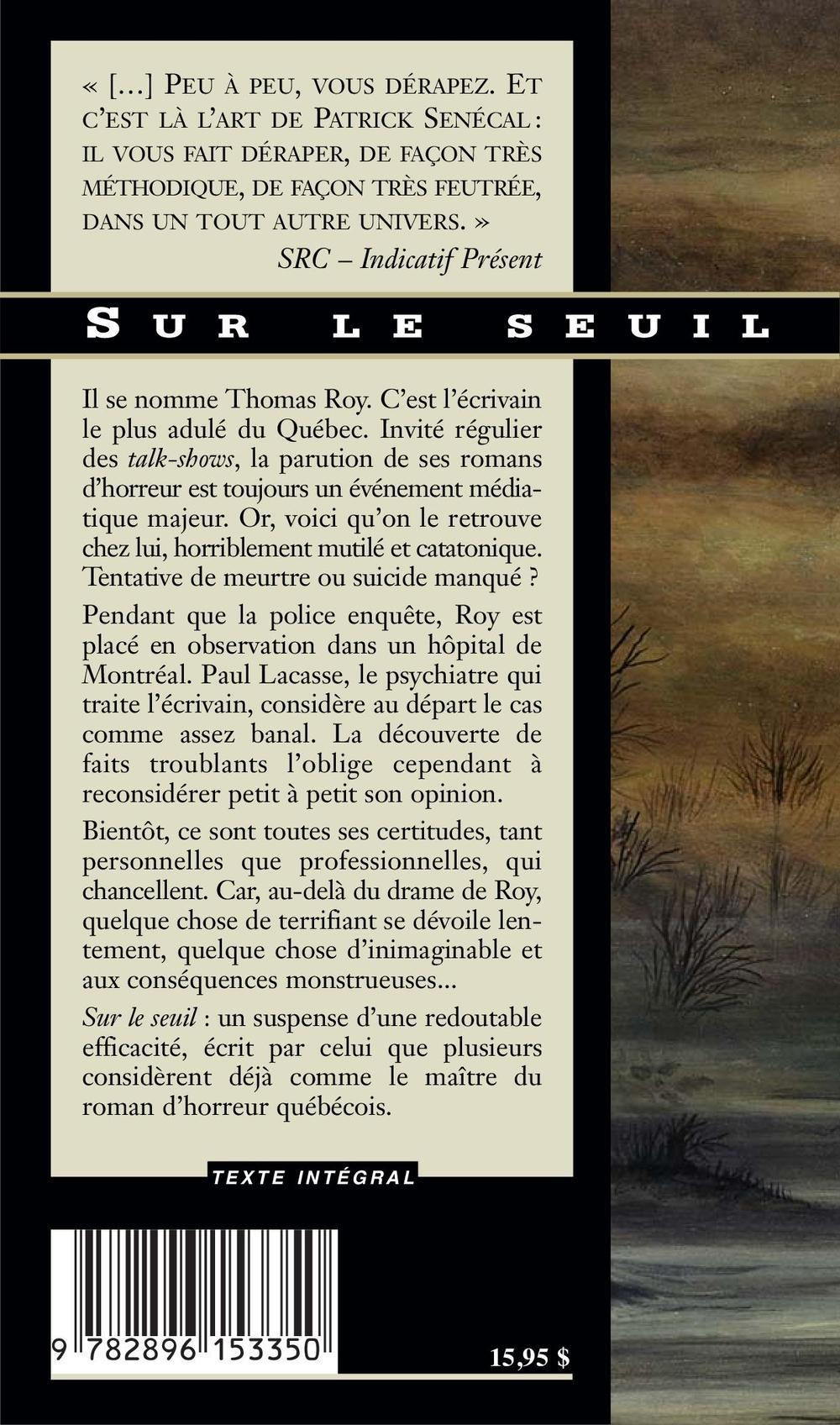 Il se nomme Thomas Roy. C’est l’écrivain le plus adulé du Québec. Invité régulier des talk-shows, la parution de ses romans d’horreur est toujours un événement médiatique majeur. Or, voici qu’on le retrouve chez lui, horriblement mutilé et catatonique. Tentative de meurtre ou suicide manqué ?Pendant que la police enquête, Roy est placé en observation dans un hôpital de Montréal. Paul Lacasse, le psychiatre qui traite l’écrivain, considère au départ le cas comme assez banal. La découverte de faits troublants l’oblige cependant à reconsidérer petit à petit son opinion. Bientôt, ce sont toutes ses certitudes, tant personnelles que professionnelles, qui chancellent. Car, au-delà du drame de Roy, quelque chose de terrifiant se dévoile lentement, quelque chose d’inimaginable et aux conséquences monstrueuses...Sur le seuil : un suspense d’une redoutable efficacité, écrit par celui que plusieurs considèrent déjà comme le maître du roman d’horreur québécois.PRIX DU PUBLIC - SALON DU LIVRE DE LA CÔTE NORD 2004PRIX MASTERTON 2007