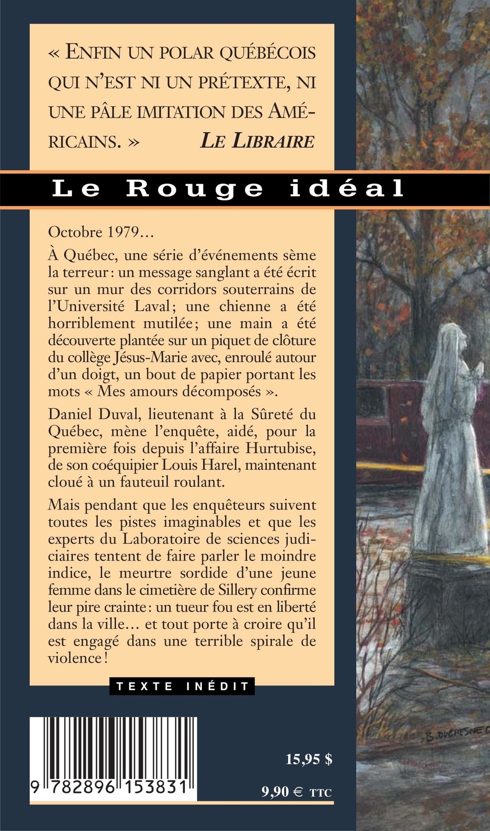 Octobre 1979…À Québec, une série d’événements sème la terreur : un message sanglant a été écrit sur un mur des corridors souterrains de l’Université Laval ; une chienne a été horriblement mutilée ; une main a été découverte plantée sur un piquet de clôture du collège Jésus-Marie avec, enroulé autour d’un doigt, un bout de papier portant les mots « Mes amours décomposés ».Daniel Duval, lieutenant à la Sûreté du Québec, mène l’enquête, aidé, pour la première fois depuis l’affaire Hurtubise, de son coéquipier Louis Harel, maintenant cloué à un fauteuil roulant.Mais pendant que les enquêteurs suivent toutes les pistes imaginables et que les experts du Laboratoire de sciences judiciaires tentent de faire parler le moindre indice, le meurtre sordide d’une jeune femme dans le cimetière de Sillery confirme leur pire crainte : un tueur fou est en liberté dans la ville… et tout porte à croire qu’il est engagé dans une terrible spirale de violence !PRIX ARTHUR-ELLIS 2003