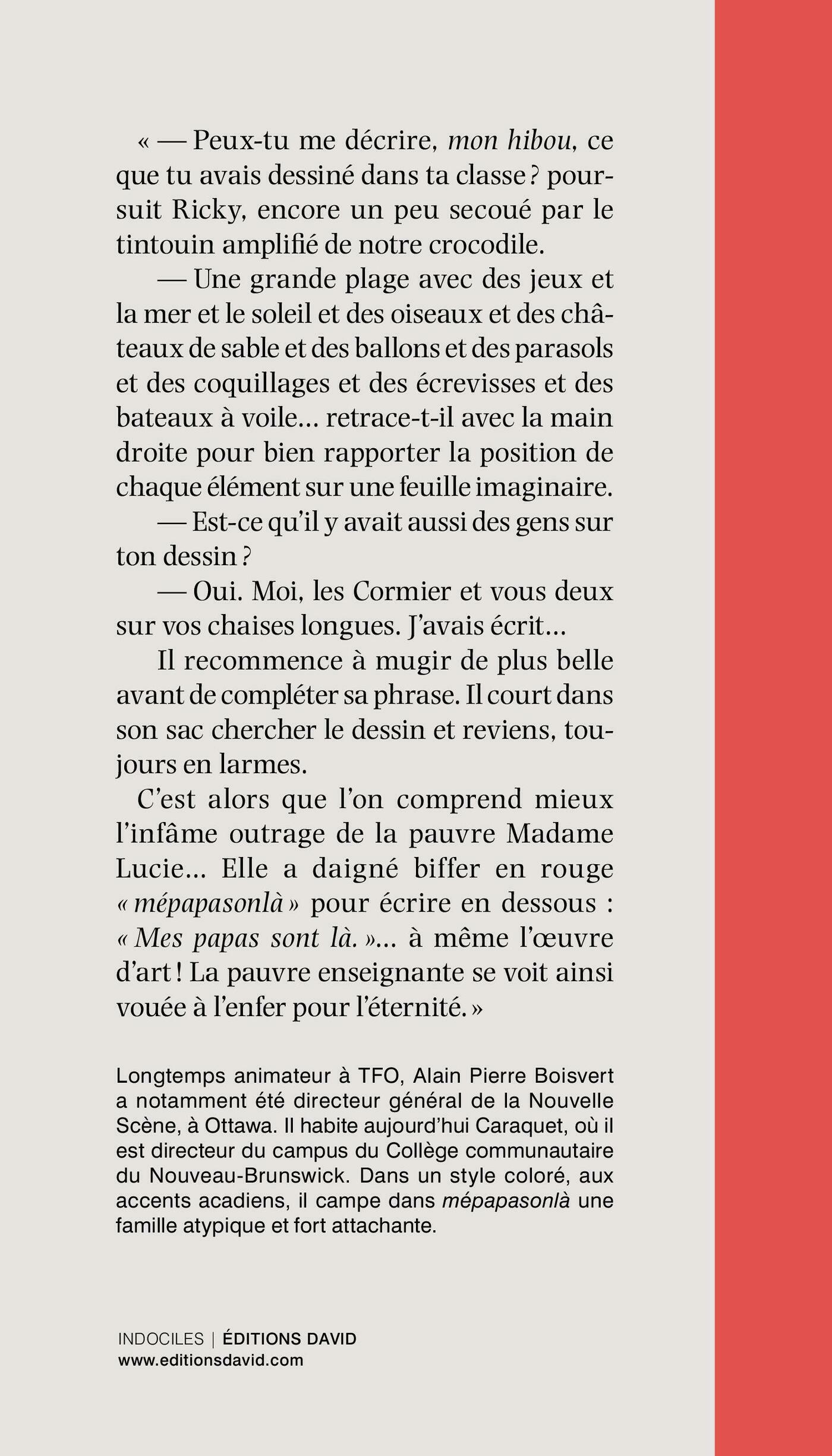 « — Peux-tu me décrire, mon hibou, ce que tu avais dessiné dans ta classe? poursuit Ricky, encore un peu secoué par le tintouin amplifié de notre crocodile. — Une grande plage avec des jeux et la mer et le soleil et des oiseaux et des châteaux de sable et des ballons et des parasols et des coquillages et des écrevisses et des bateaux à voile… retrace-t-il avec la main droite pour bien rapporter la position de chaque élément sur une feuille imaginaire. — Est-ce qu’il y avait aussi des gens sur ton dessin ? — Oui. Moi, les Cormier et vous deux sur vos chaises longues. J’avais écrit…Il recommence à mugir de plus belle avant de compléter sa phrase. Il court dans son sac chercher le dessin et reviens, toujours en larmes. C’est alors que l’on comprend mieux l’infâme outrage de la pauvre Madame Lucie… Elle a daigné biffer en rouge “mépapasonlà” pour écrire en dessous : “Mes papas sont là.”… à même l’œuvre d’art ! La pauvre enseignante se voit ainsi vouée à l’enfer pour l’éternité. »