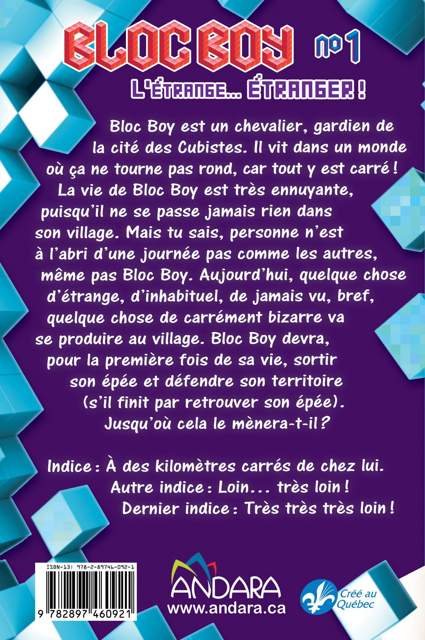 Bloc Boy est un chevalier, gardien de la cité des Cubistes. Il vit dans un monde où ça netourne pas rond, car tout y est carré! La vie de Bloc Boy est très ennuyante, car il ne sepasse jamais rien. Mais tu sais, personne n’est à l’abri d’une journée pas comme les autres,même pas Bloc Boy. Aujourd’hui, quelque chose d’étrange, d’inhabituel, de jamaisvu, bref, quelque chose de carrément bizarre va se produire au village. Bloc Boy devra,pour la première fois de sa vie, sortir son épée et défendre son territoire (s’il finit parretrouver son épée). Mais jusqu’où cela le mènera-t-il?Indice : À des kilomètres carrés de chez lui.Autre indice : Loin… très loin!Dernier indice : Très, très, très loin!