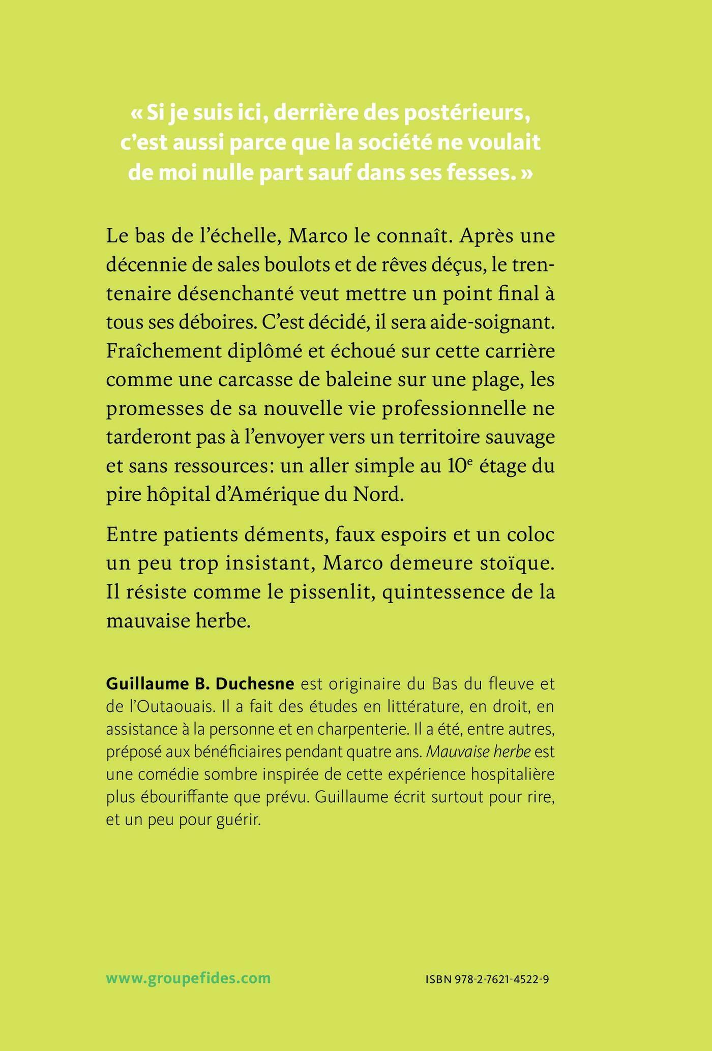 « Si je suis ici, derrière des postérieurs, c’est aussi parce que la société ne voulait de moi nulle part sauf dans ses fesses. » Le bas de l'échelle, Marco le connaît. Après une décennie de sales boulots et de rêves déçus, le trentenaire désenchanté veut mettre un point final à tous ses déboires. C’est décidé, il sera aide-soignant. Fraîchement diplômé et échoué sur cette carrière comme une carcasse de baleine, les promesses de sa nouvelle vie professionnelle ne tarderont pas à l’envoyer vers un territoire sauvage et sans ressource : un aller simple au 10e étage du pire hôpital d’Amérique. Entre les patients déments, les faux espoirs et un coloc un peu trop insistant, Marco demeure stoïque. Il résiste comme le pissenlit, quintessence de la mauvaise herbe.