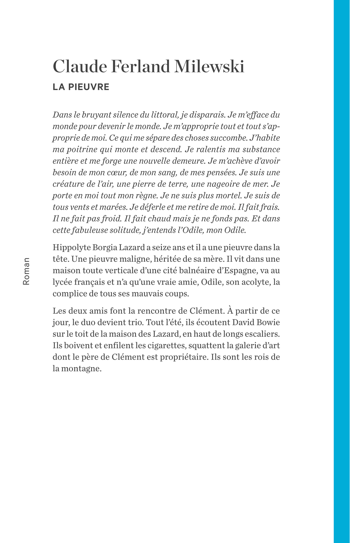 Hippolyte Borgia Lazard a seize ans et il a une pieuvre dans la tête. Une pieuvre maligne, héritée de sa mère. Il vit dans une maison toute verticale d’une cité balnéaire d’Espagne, va au lycée français et n’a qu’une vraie amie, Odile, son acolyte, la complice de tous ses mauvais coups. Le quotidien est marqué par la maladie – celle de la mère et celle du fils –, par les visites à la mer, par les excentricités d’Odile, qui entraîne son ami dans toutes sortes de folles courses à travers la ville : chasses à l’homme, missions d’espionnage, jeux de rôle et petits larcins. Hippolyte tente de la suivre, tant bien que mal, alourdi par la pieuvre qui remue dans son cerveau. Les deux amis font la rencontre de Clément, dont Hippolyte tombe éperdument amoureux : « Clément, ma digue. Clément, la falaise d’où je vois tout, d’où le monde m’apparaît. » À partir de ce jour, le duo devient trio. Tout l’été, ils écoutent David Bowie sur le toit de la maison des Lazard, en haut de longs escaliers. Ils boivent et enfilent les cigarettes, squattent la galerie d’art dont le père de Clément est propriétaire. Ils sont les rois de la montagne. Porté par une langue où tout est musique, mouvement, forme, couleur, le premier roman de Claude Ferland Milewski est l’affirmation d’un fabuleux tempérament artistique.