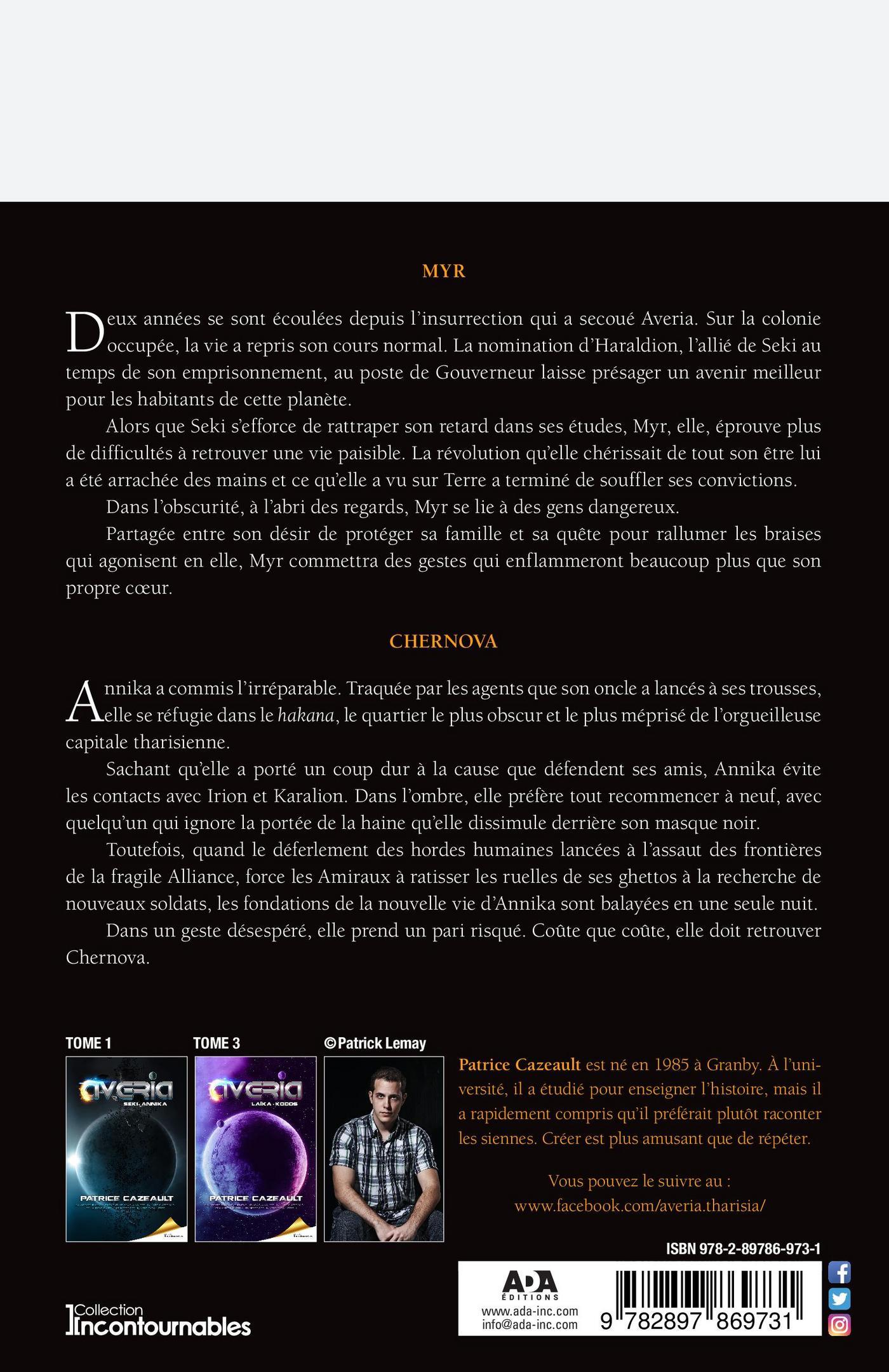 MyrDeux années se sont écoulées depuis l’insurrection qui a secoué Averia. Sur la colonie occupée, la vie a repris son cours normal. La nomination d’Haraldion, l’allié de Seki au temps de son emprisonnement, au poste de Gouverneur laisse présager un avenir meilleur pour les habitants de cette planète.Alors que Seki s’efforce de rattraper son retard dans ses études, Myr, elle, éprouve plus de difficultés à retrouver une vie paisible. La révolution qu’elle chérissait de tout son être lui a été arrachée des mains et ce qu’elle a vu sur Terre a terminé de souffler ses convictions.Dans l’obscurité, à l’abri des regards, Myr se lie à des gens dangereux.Partagée entre son désir de protéger sa famille et sa quête pour rallumer les braises qui agonisent en elle, Myr posera des gestes qui enflammeront beaucoup plus que son propre coeur.ChernovaAnnika a commis l’irréparable.Traquée par les agents que son oncle a lancés à ses trousses, elle se réfugie dans le Hakana, le quartier le plus obscur et le plus méprisé de l’orgueilleuse capitale tharisienne.Sachant qu’elle a porté un coup dur à la cause que défendent ses amis, Annika évite les contacts avec Irion et Karalion. Dans l’ombre, elle préfère tout recommencer à neuf, avec quelqu’un qui ignore toute la portée de la haine qu’elle dissimule derrière son masque noir.Toutefois, lorsque le déferlement des hordes humaines, lancées à l’assaut des frontières de la fragile Alliance, force les Amiraux à ratisser les ruelles de ses ghettos à la recherche de nouveaux soldats, les fondations de la nouvelle vie d’Annika sont balayées en une seule nuit.Dans un geste désespéré, elle prend un pari risqué.Coûte que coûte, elle doit retrouver Chernova.