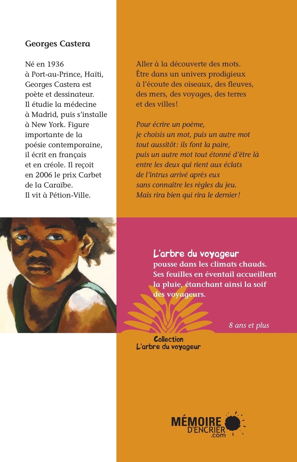 Un beau livre pour découvrir les mots, les images, les formes et l'aventure de la langue. Un des plus grands poètes contemporains de langue française, Georges Castera, propose aux jeunes d'aller à la découverte de l'univers de si belle manière, entre les oiseaux, les fleuves, les mers, les voyages, les terres et les villes. Avec ce livre qui donne aux mots, aux phrases et aux formes leur sens le plus complet, les jeunes peuvent se dire que par la poésie tout est possible, même l'invention de la vie. L'ouvrage Le coeur sur la main est illustré par Mance Lanctôt, peintre et illustratrice, qui met en dialogue les mots et les phrases dans une série de portraits, de traits, de formes et de paysages marrons. Le livre est ainsi le résultat du dialogue entre une peintre québécoise et un poète haïtien. Pour écrire un poème,/ je choisis un mot, / puis un autre mot / tout aussitôt :/ ils font la paire, / puis un autre mot / tout étonné / d'être là / entre les deux / qui rient aux / éclats / de l'intrus / arrivé après eux / sans connaître / les règles du jeu. / Mais rira bien / qui rira le dernier !