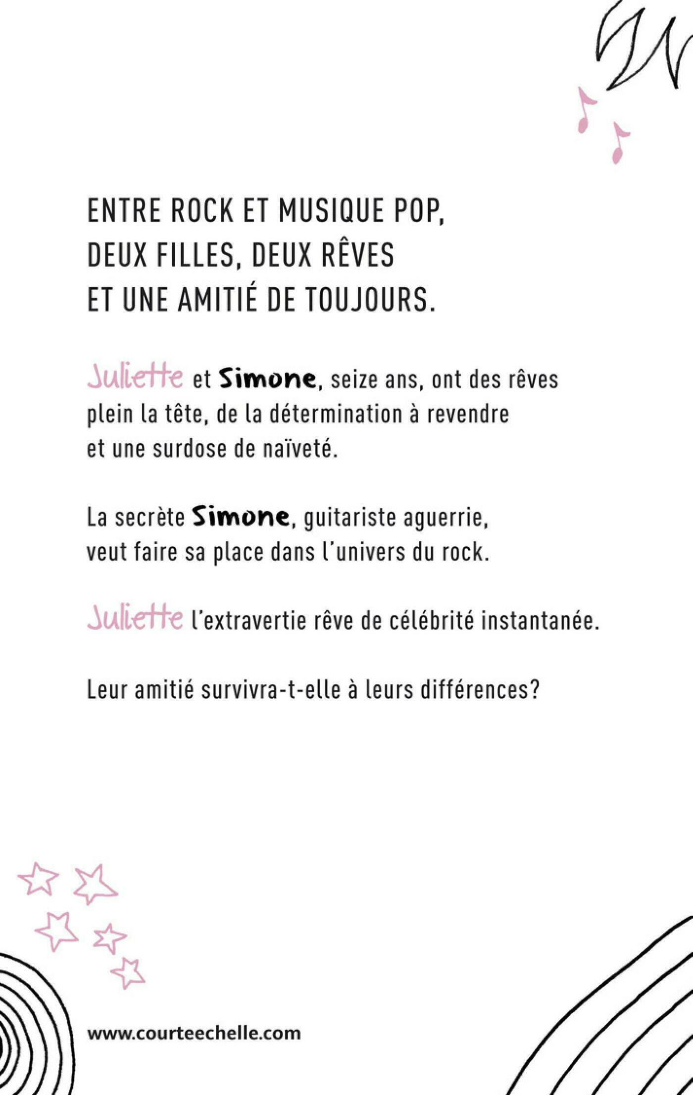Juliette et Simone ont des rêves plein la tête, de la détermination à revendre et une surdose de naïveté. La secrète Simone, guitariste aguerrie, veut faire sa place dans l’univers du rock. Juliette l’extravertie rêve de célébrité instantanée. Leur amitié survivra-t-elle à leurs différences ?