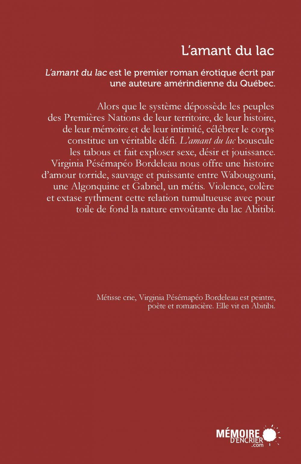 Virginia Pésémapéo Bordeleau, dans L'amant du lac, offre une histoire d'amour torride entre Wabougouni, une Algonquine et Gabriel, un métis. Le récit, qui se déroule dans l'atmosphère envoûtante du lac Abitibi, fait découvrir quelque chose d'inédit : l'amour, le désir, la jouissance dans le quotidien autochtone. L'amant du lac est un livre digne au sens où il fait échec aux idéologies du ressentiment chez les peuples des Premières Nations. On y retrouve une histoire où l'Autochtone n'est pas que souffrances, que victime. Il est corps. Il est désir. Il est avenir.