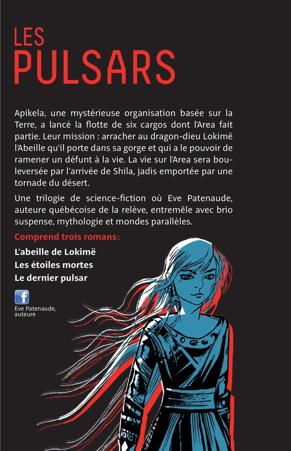 Le coffret Les Pulsars comprend les trois tomes de la trilogie : • L’abeille de Lokimë • Les étoiles mortes • Le dernier pulsarApikela, une organisation basée sur la Terre, a lancé la flotte de six cargos dont l’Area fait partie. Leur mission : arracher au dragon-dieu Lokimë l’Abeille qu’il porte dans sa gorge et qui a le pouvoir de ramener un défunt à la vie. La vie sur l’Area sera bouleversée par l’arrivée de Shila, jadis emportée une par une tornade du désert.Une trilogie de science-fiction où Eve Patenaude entremêle avec brio suspense, mythologie et mondes parallèles.