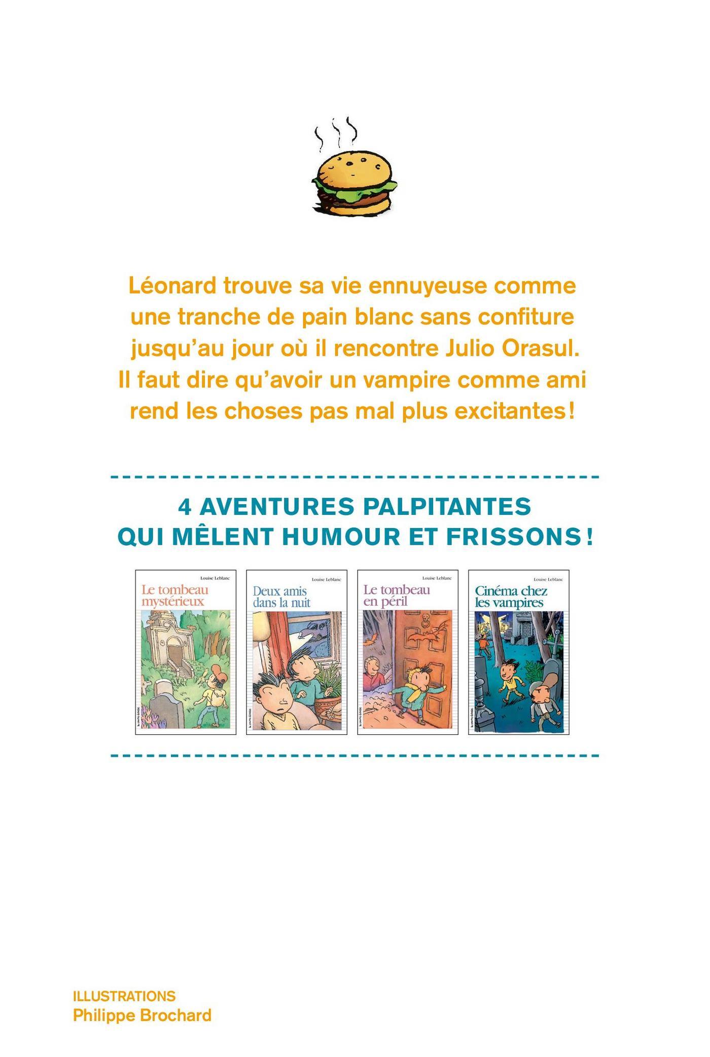 Léonard trouve sa vie ennuyeuse comme une tranche de pain blanc sans confiture jusqu’au jour où il rencontre Julio Orasul. Il faut dire qu’avoir un vampire comme ami rend les choses pas mal plus palpitantes !Cette amitié extraordinaire entre un petit humain et un jeune vampire donnera lieu à des moments cocasses, mais leur permettra aussi de vivre des aventures inquiétantes dans lesquelles l’action ne manquera pas.Mélangeant humour et frissons, la série Léonard fera le bonheur de ceux et celles qui aiment le suspense, la fantaisie et le mystère.Ce premier volume réunit «Le tombeau mystérieux», «Deux amis dans la nuit», «Le tombeau en péril» et «Cinéma chez les vampires».