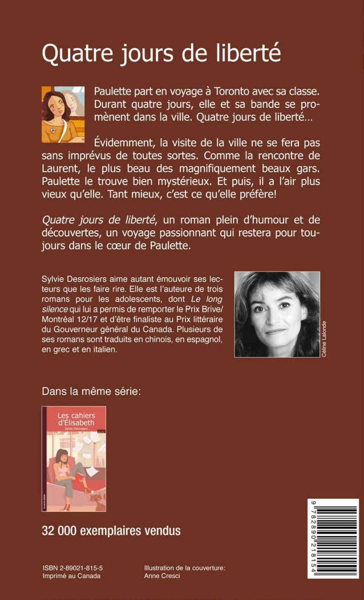 Paulette part en voyage à Toronto avec sa classe. Durant quatre jours, elle et sa bande se promènent dans la ville. Quatre jours de liberté… Évidemment, la visite de la ville ne se fera pas sans imprévus de toutes sortes. Comme la rencontre de Laurent, le plus beau des magnifiquement beaux gars. Paulette le trouve bien mystérieux. Et puis, il a l’air plus vieux qu’elle. Tant mieux, c’est ce qu’elle préfère! Quatre jours de liberté, un roman plein d’humour et de découvertes, un voyage passionnant qui restera pour toujours dans le cœur de Paulette.