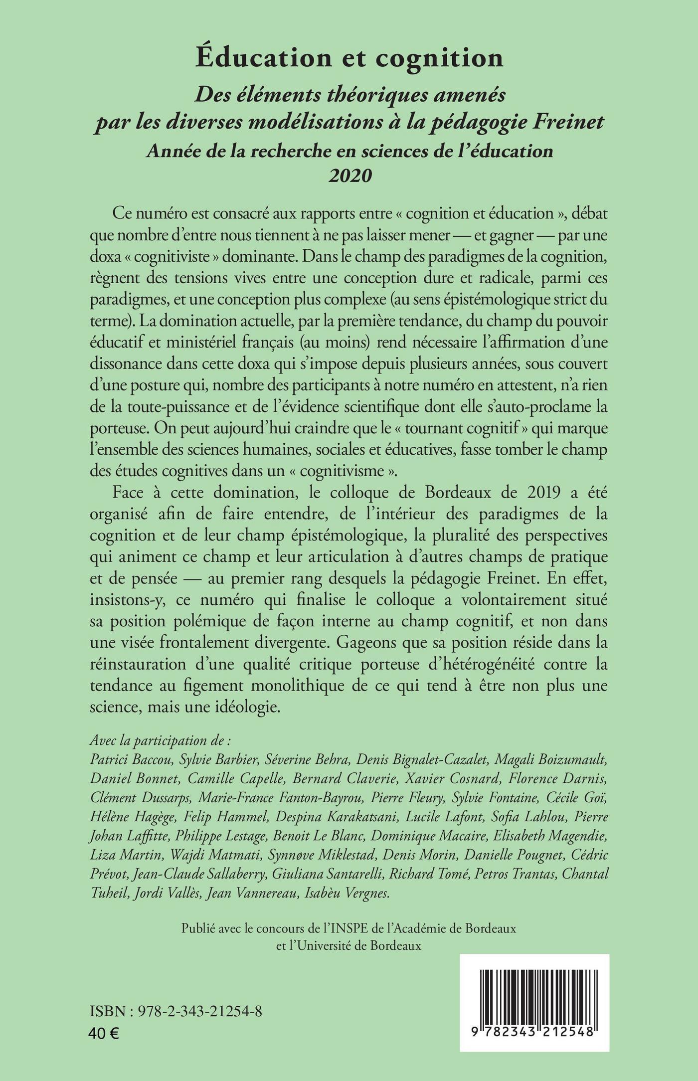 Ce numéro est consacré aux rapports entre « cognition et éducation », débat que nombre d'entre nous tiennent à ne pas laisser mener, et gagner, par une doxa « cognitiviste » dominante. Dans le champ des paradigmes de la cognition, règnent des tensions vives entre une conception dure et radicale, parmi ces paradigmes, et une conception plus complexe (au sens épistémologique strict du terme). La domination actuelle, par la première tendance, du champ du pouvoir éducatif et ministériel français (au moins) rend nécessaire l’affirmation d’une dissonance dans cette doxa qui s’impose depuis plusieurs années, sous couvert d’une posture qui, nombre des participants à notre numéro en attestent, n’a rien de la toute-puissance et de l’évidence scientifique dont elle s’auto-proclame la porteuse.