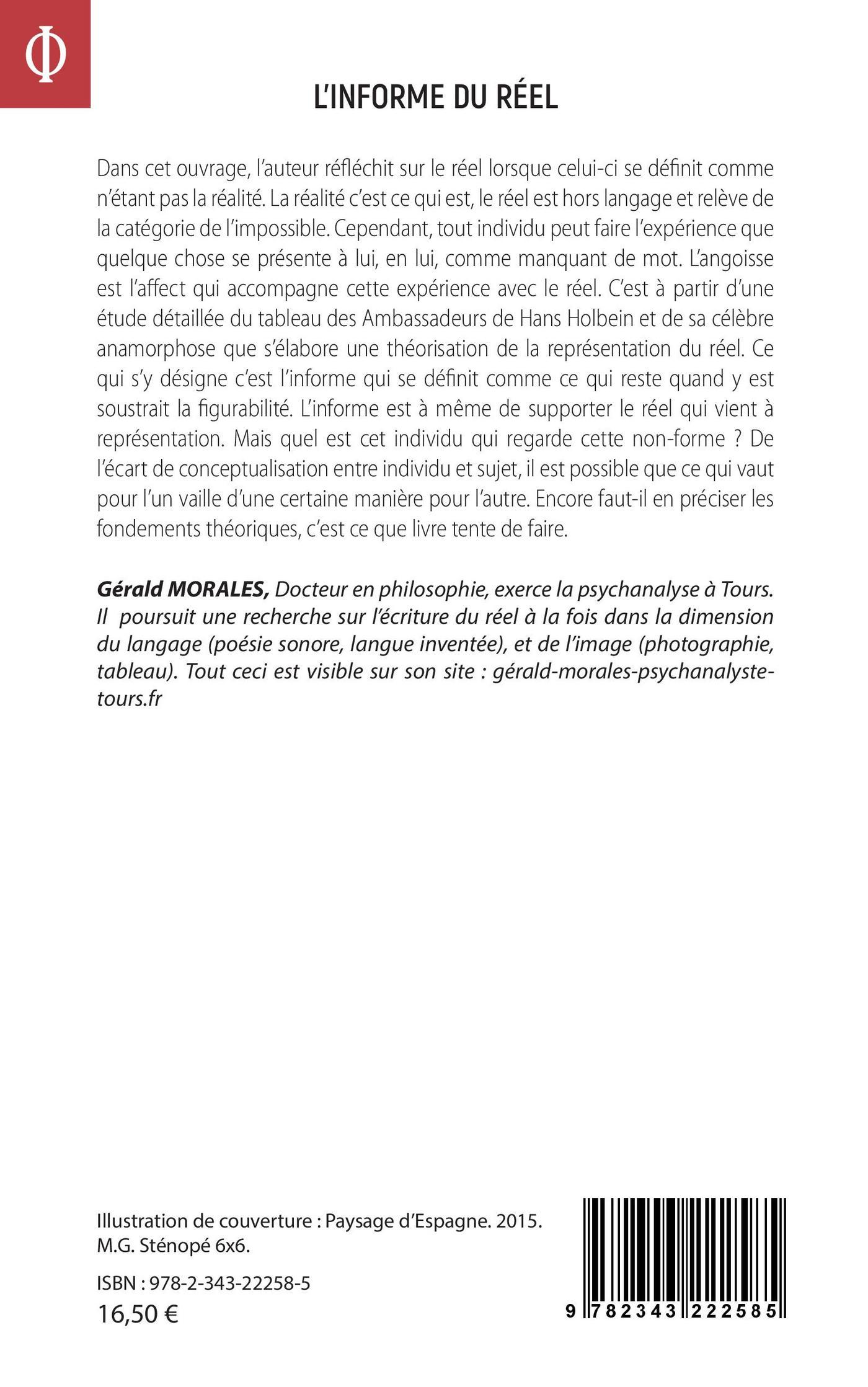Cet ouvrage est une réflexion sur le réel lorsque celui-ci se définit comme n'étant pas la réalité. La réalité c'est ce qui est, le réel est hors langage et relève de la catégorie de l'impossible. Cependant, tout individu peut faire l'expérience que quelque chose se présente à lui, en lui, comme manquant de mot. L'angoisse est l'affect qui accompagne cette expérience. C'est à partir d'une étude détaillée du tableau des Ambassadeurs de Hans Holbein et de sa célèbre anamorphose que s'élabore une théorisation de la représentation du réel. Ce qui s'y désigne c'est l'informe qui se définit comme ce qui reste quand y est soustrait la figurabilité. L'informe est à même de supporter le réel qui vient à représentation. Mais quel est cet individu qui regarde cette non-forme ? De l'écart de conceptualisation entre individu et sujet, il est possible que ce qui vaut pour l'un vaille d'une certaine manière pour l'autre.