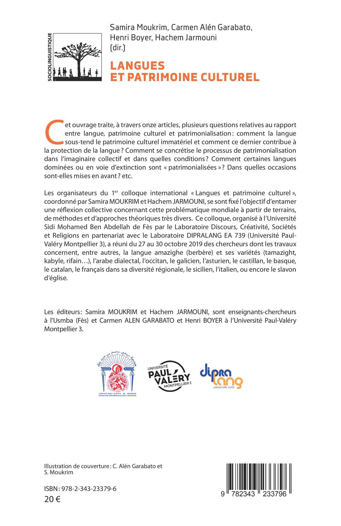 Cet ouvrage traite, à travers onze articles, plusieurs questions relatives au rapport entre langue, patrimoine culturel et patrimonialisation : comment la langue sous-tend le patrimoine culturel immatériel et comment ce dernier contribue à la protection de la langue ? Comment se concrétise le processus de patrimonialisation dans l'imaginaire collectif et dans quelles conditions? Comment certaines langues dominées ou en voie d'extinction sont « patrimonialisées » ? Dans quelles occasions sont-elles mises en avant ? etc.Les organisateurs du 1er colloque international « Langues et patrimoine culturel », coordonné par Samira MOUKRIM et Hachem JARMOUNI, se sont fixé l'objectif d'entamer une réflexion collective concernant cette problématique mondiale à partir de terrains, de méthodes et d'approches théoriques très divers. Ce colloque, organisé à l'Université Sidi Mohamed Ben Abdellah de Fès par le Laboratoire Discours, Créativité, Sociétés et Religions en partenariat avec le Laboratoire DIPRALANG EA 739 (Université Paul-Valéry Montpellier 3), a réuni du 27 au 30 octobre 2019 des chercheurs dont les travaux concernent, entre autres, la langue amazighe (berbère) et ses variétés (tamazight, kabyle, rifain...), l'arabe dialectal, l'occitan, le galicien, l'asturien, le castillan, le basque, le catalan, le français dans sa diversité régionale, le sicilien, l'italien, ou encore le slavon d 'église