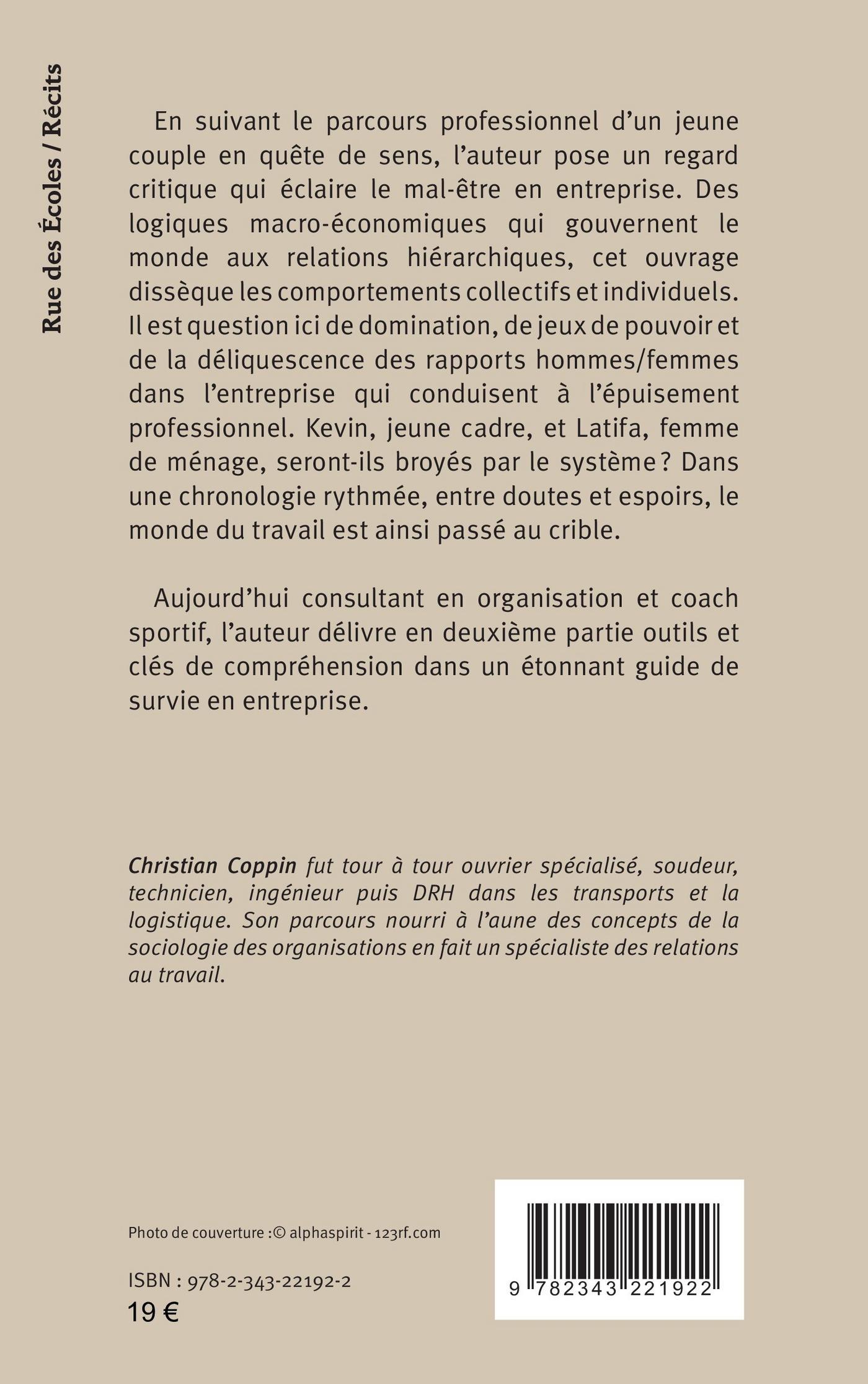 En suivant le parcours professionnel d’un jeune couple en quête de sens, l’auteur pose un regard critique qui éclaire le mal-être en entreprise. Des logiques macro-économiques qui gouvernent le monde aux relations hiérarchiques, cet ouvrage dissèque les comportements collectifs et individuels. Il est question ici de domination, de jeux de pouvoir et de la déliquescence des rapports hommes/femmes dans l’entreprise qui conduisent à l’épuisement professionnel. Kevin, jeune cadre, et Latifa, femme de ménage, seront-ils broyés par le système ? Dans une chronologie rythmée, entre doutes et espoirs, le monde du travail est ainsi passé au crible. Aujourd’hui consultant en organisation et coach sportif, l’auteur délivre en deuxième partie outils et clés de compréhension dans un étonnant guide de survie en entreprise.