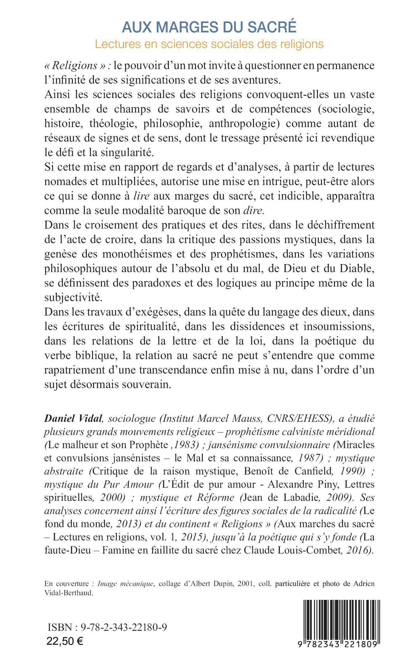 « Religions » : le pouvoir d’un mot invite à questionner en permanence l’infinité de ses significations. Ainsi les sciences sociales des religions convoquent-elles un vaste ensemble de champs de savoirs et de compétences comme autant de réseaux de signes et de sens, dont le tressage revendique le défi et la singularité. Si cette mise en rapport de regards et d’analyses autorise une mise en intrigue, peut-être alors ce qui se donne à lire aux marges du sacré, cet indicible, apparaîtra comme la seule modalité baroque de son dire. Dans le croisement des pratiques et des rites, dans le déchiffrement de l’acte de croire, ou bien encore ans la critique des passions mystiques, se définissent des paradoxes et des logiques au principe même de la subjectivité. Dans les travaux d’exégèses, dans la quête du langage des dieux, dans les écritures de spiritualité ou les dissidences, la relation au sacré ne peut s’entendre que comme rapatriement d’une transcendance enfin mise à nu, dans l’ordre d’un sujet désormais souverain.
