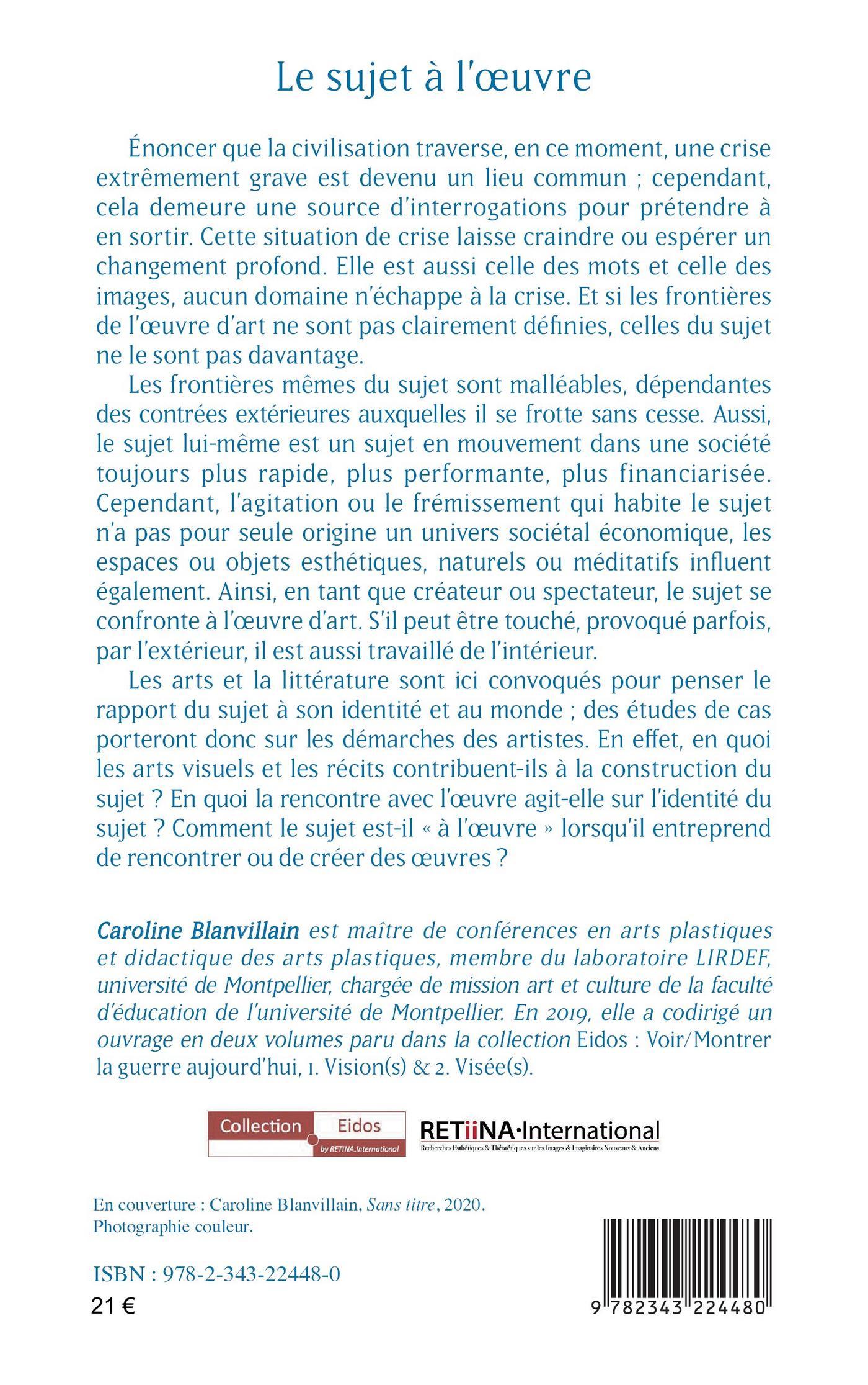 La situation de crise que nous traversons laisse craindre ou espérer un changement profond. C’est aussi celle des mots et des images. Et si les frontières de l’oeuvre d’art ne sont pas clairement définies, celles du sujet ne le sont pas davantage. Ses frontières sont malléables, dépendantes des contrées extérieures auxquelles il se frotte sans cesse. C’est un sujet en mouvement dans une société toujours plus rapide, plus performante, plus financiarisée. Cependant, l’agitation qui l'habite n’a pas pour seule origine un univers sociétal économique. Les espaces ou objets esthétiques, naturels ou méditatifs influent également. Qu'il soit créateur ou spectateur, le sujet se confronte à l’oeuvre d’art. Les arts et la littérature sont ici convoqués pour penser le rapport du sujet à son identité et au monde. En quoi les arts contribuent-ils à la construction du sujet ? En quoi la rencontre avec l’oeuvre agit-elle sur son identité ? Comment le sujet est-il "à l’oeuvre" lorsqu’il rencontre ou crée des oeuvres ?