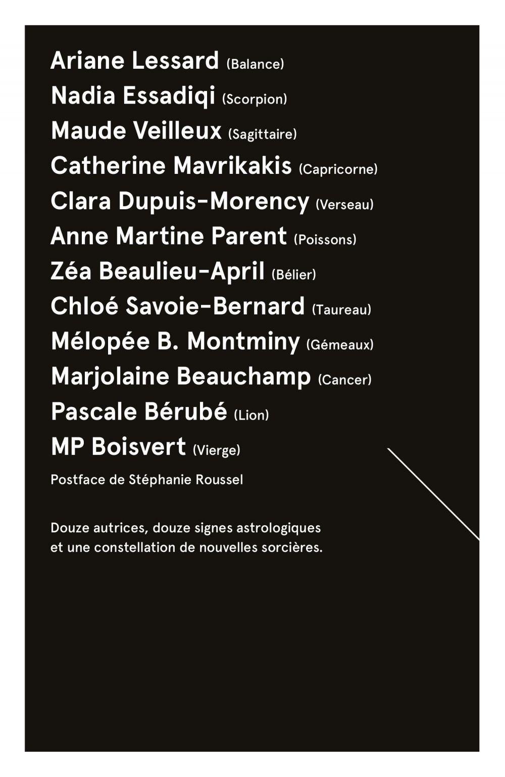 Zodiaque présente douze fictions, récits et textes inclassables écrits par une sélection d’autrices parmi les plus pertinentes de la littérature actuelle et de la relève.On la partage, on l’utilise en filtre Instagram, on la commente et on se la réapproprie malgré ses connotations commerciales, ésotériques, voire quétaines, l’astrologie nous attire, parce qu’elle parle de nous. Elle est réponse dans les jours sombres et source d’espoir pour le futur. Un peu de magie pour nous rappeler que nos vies sont meublées d’impondérable, un peu de sorcellerie pour tenter d’agir sur les forces qui nous échappent. Avec des textes de Mélopée B. Montminy (Gémeaux),Marjolaine Beauchamp (Cancer), Zéa Beaulieu-April (Bélier), Pascale Bérubé (Lion), MP Boisvert (Vierge), Clara Dupuis-Morency (Verseau), Nadia Essadiqi aka La Bronze (Scorpion), Ariane Lessard (Balance), Catherine Mavrikakis (Capricorne), Anne Martine Parent (Poissons), Chloé Savoie-Bernard (Taureau) et Maude Veilleux (Sagittaire).