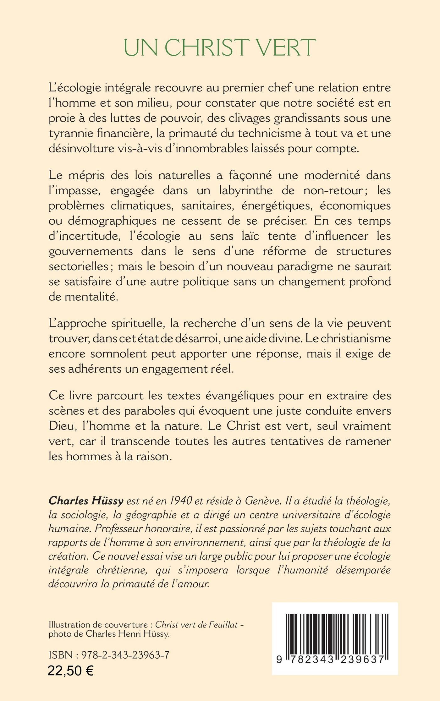 L’écologie intégrale recouvre au premier chef une relation entre l’homme et son milieu, pour constater que notre société est en proie à des luttes de pouvoir, des clivages grandissants sous une tyrannie financière, la primauté du technicisme et une désinvolture vis-à-vis d’innombrables laissés pour compte. Le mépris des lois naturelles a façonné une modernité dans l’impasse, engagée dans un labyrinthe de non-retour. En ces temps d’incertitude, l’écologie au sens laïc tente d’influencer les gouvernements dans le sens d’une réforme de structures sectorielles ; mais le besoin d’un nouveau paradigme ne saurait se satisfaire d’une autre politique sans un changement profond de mentalité. L’approche spirituelle, la recherche d’un sens de la vie peuvent trouver une aide divine. Le christianisme encore somnolent peut apporter une réponse, mais il exige un engagement réel. Cet ouvrage parcourt les textes évangéliques pour en extraire des scènes et des paraboles qui évoquent une juste conduite envers Dieu, l’homme et la nature. Le Christ est vert car il transcende toutes les autres tentatives de ramener les hommes à la raison.
