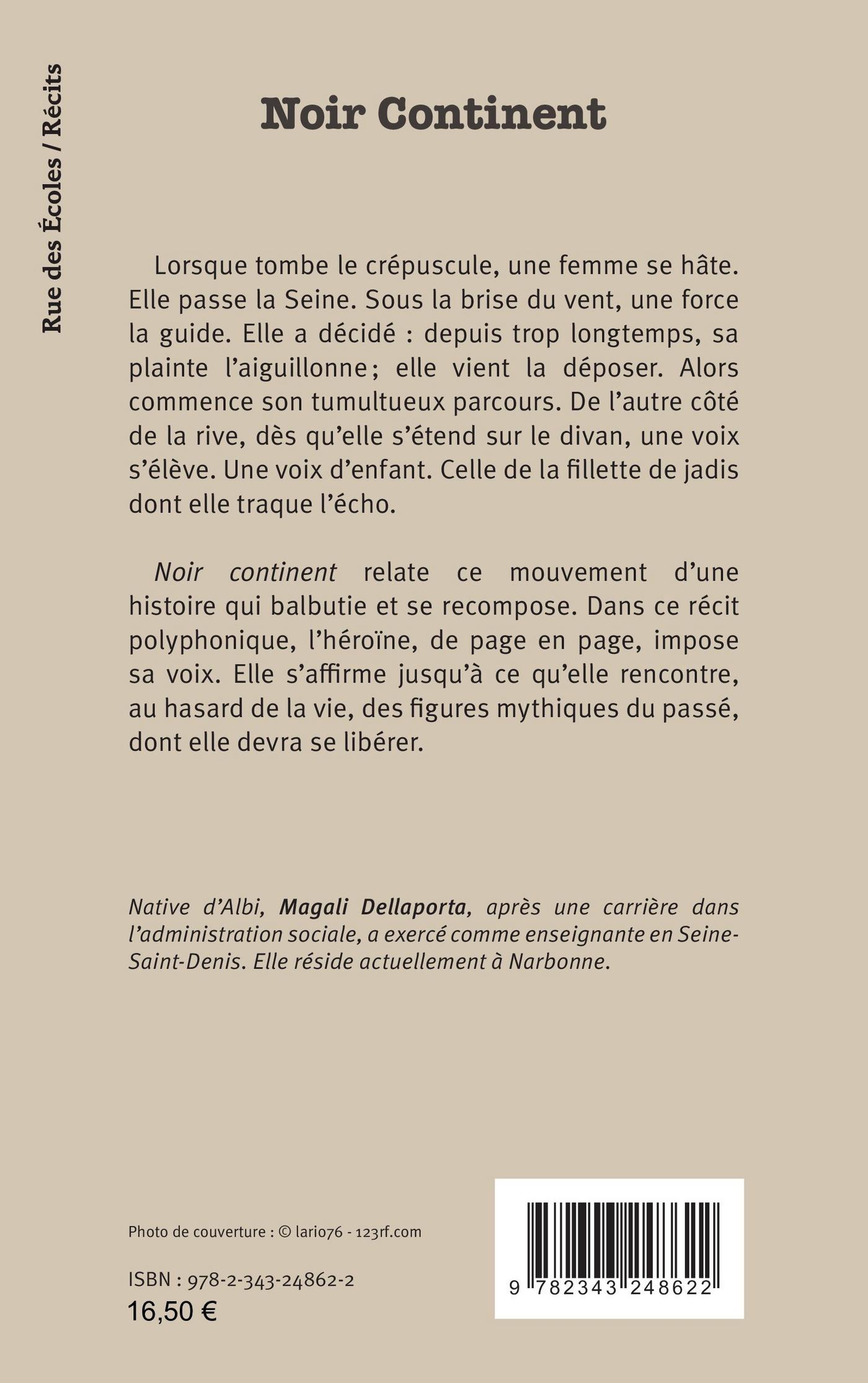 Lorsque tombe le crépuscule, une femme se hâte. Elle passe la Seine. Sous la brise du vent, une force la guide. Elle a décidé : depuis trop longtemps, sa plainte l’aiguillonne ; elle vient la déposer. Alors commence son tumultueux parcours. De l’autre côté de la rive, dès qu’elle s’étend sur le divan, une voix s’élève. Une voix d’enfant. Celle de la fillette de jadis dont elle traque l’écho. Noir continent relate ce mouvement d’une histoire qui balbutie et se recompose. Dans ce récit polyphonique, l’héroïne, de page en page, impose sa voix. Elle s’affirme jusqu’à ce qu’elle rencontre, au hasard de la vie, des figures mythiques du passé, dont elle devra se libérer.