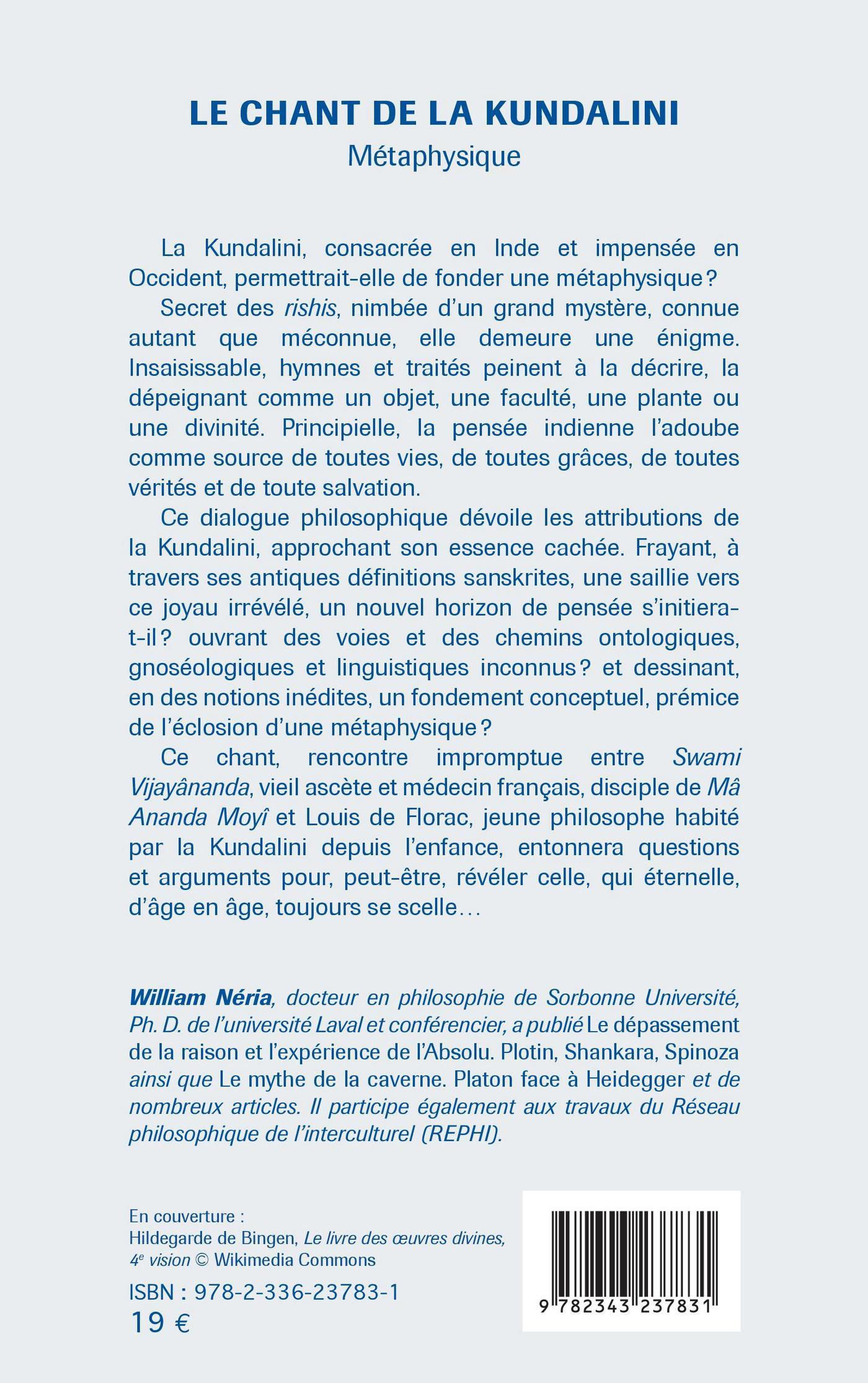La Kundalini, consacrée en Inde et impensée en Occident, permettrait-elle de fonder une métaphysique ? Secret des rishis, nimbée d'un grand mystère, connue autant que méconnue, elle demeure une énigme. Insaisissable, hymnes et traités peinent à la décrire, la dépeignant comme un objet, une faculté, une plante ou une divinité. Principielle, la pensée indienne l'adoube comme source de toutes vies, de toutes grâces, de toutes vérités et de toute salvation. Ce dialogue philosophique dévoile les attributions de la Kundalini, approchant son essence cachée. Frayant, à travers ses antiques définitions sanskrites, une saillie vers ce joyau irrévélé, un nouvel horizon de pensée s'initierait-il ?