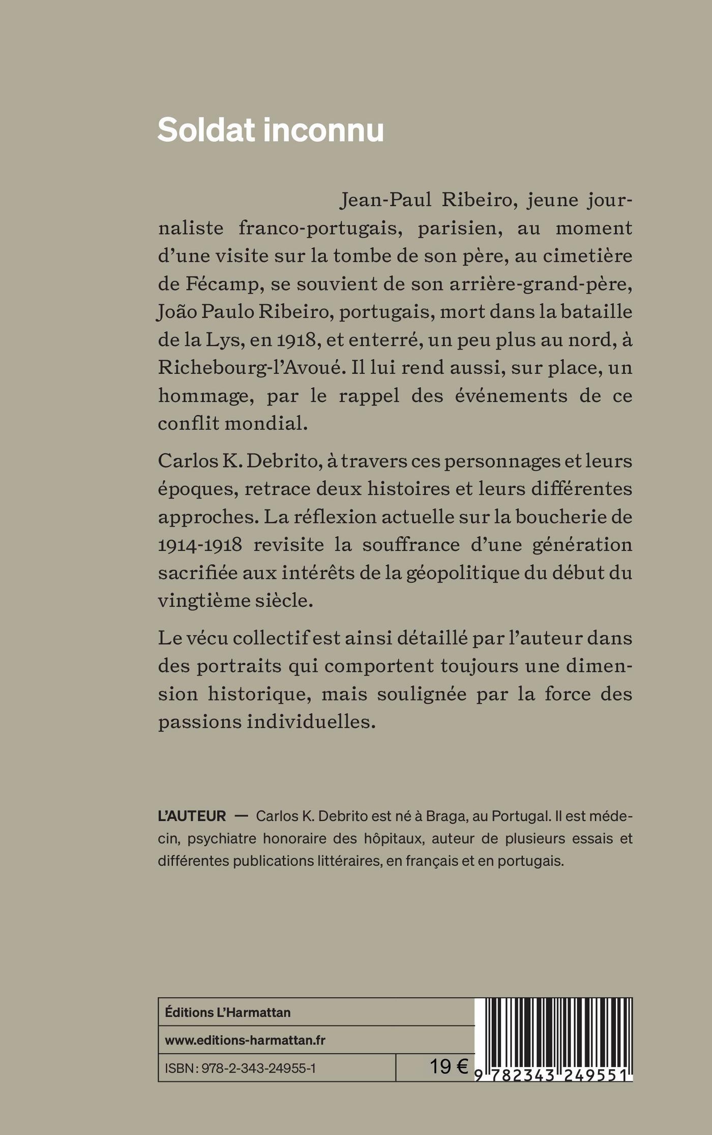 Jean-Paul Ribeiro, jeune jour-naliste franco-portugais, parisien, au moment d’une visite sur la tombe de son père, au cimetière de Fécamp, se souvient de son arrière-grand-père, João Paulo Ribeiro, portugais, mort dans la bataille de la Lys, en 1918, et enterré, un peu plus au nord, à Richebourg-l’Avoué. Il lui rend aussi, sur place, un hommage, par le rappel des événements de ce conflit mondial.Carlos K. Debrito, à travers ces personnages et leurs époques, retrace deux histoires et leurs différentes approches. La réflexion actuelle sur la boucherie de 1914-1918 revisite la souffrance d’une génération sacrifiée aux intérêts de la géopolitique du début du vingtième siècle.Le vécu collectif est ainsi détaillé par l’auteur dans des portraits qui comportent toujours une dimension historique, mais soulignée par la force des passions individuelles.