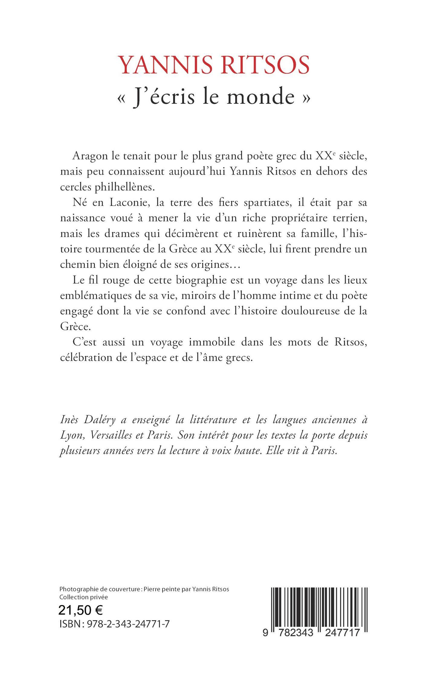 Aragon le tenait pour le plus grand poète grec du XXe siècle, mais peu connaissent aujourd’hui Yannis Ritsos en dehors des cercles philhellènes. Né en Laconie, la terre des fiers spartiates, il était par sa naissance voué à mener la vie d’un riche propriétaire terrien, mais les drames qui décimèrent et ruinèrent sa famille, l’histoire tourmentée de la Grèce au XXe siècle, lui firent prendre un chemin bien éloigné de ses origines... Le fil rouge de cette biographie est un voyage dans les lieux emblématiques de sa vie, miroirs de l’homme intime et du poète engagé dont la vie se confond avec l’histoire douloureuse de la Grèce. C’est aussi un voyage immobile dans les mots de Ritsos, célébration de l’espace et de l’âme grecs.