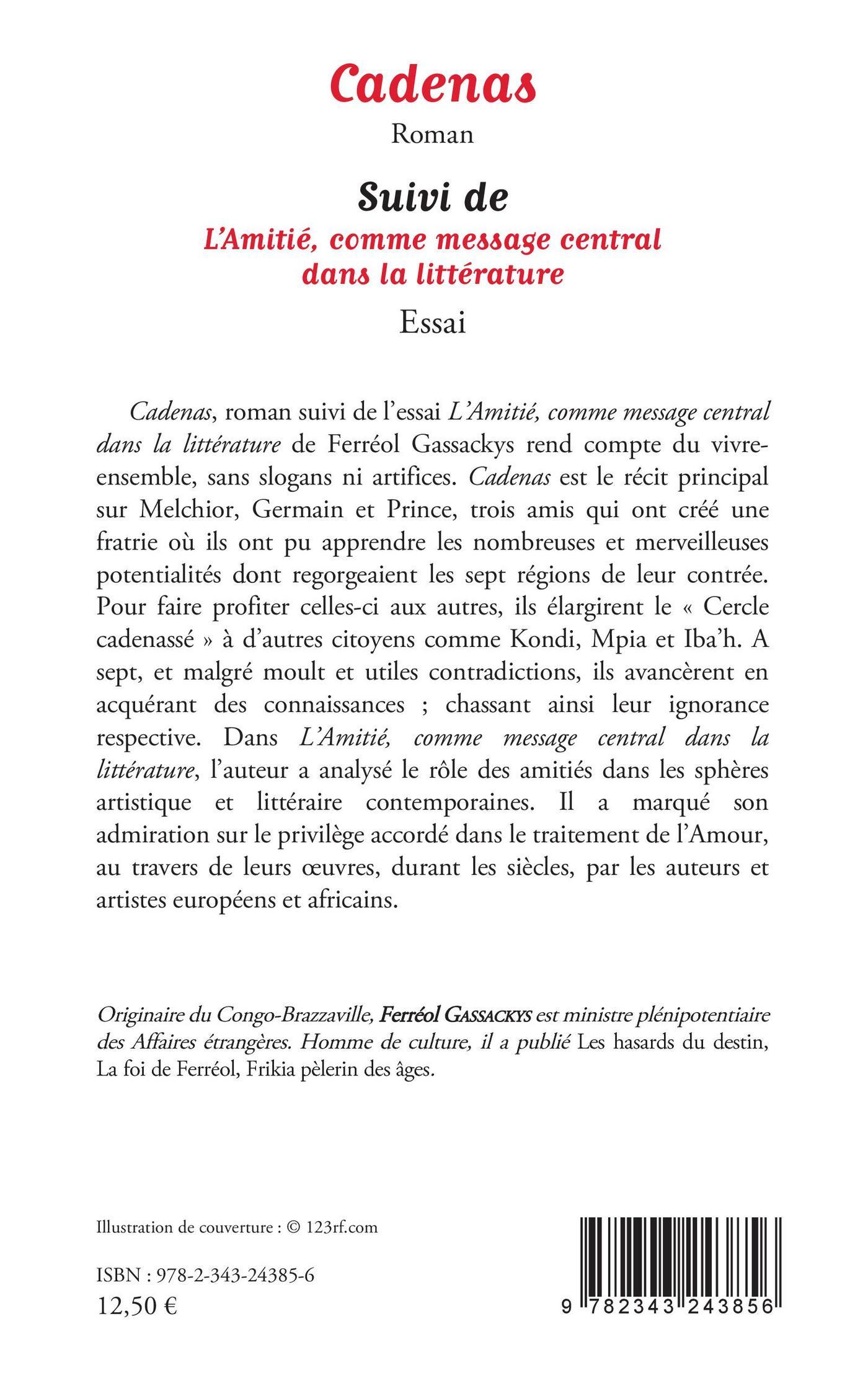 Cet ouvrage rend compte du vivre ensemble, sans slogans ni artifices. Cadenas est le récit principal sur Melchior, Germain et Prince, trois amis qui ont créé une fratrie où ils ont pu apprendre les nombreuses et merveilleuses potentialités dont regorgeaient les sept régions de leur contrée. Dans L'Amitié, comme message central dans la littérature, l'auteur a analysé le rôle des amitiés dans les sphères artistique et littéraire contemporaines. Il a marqué son admiration sur le privilège accordé dans le traitement de l'Amour, au travers de leurs uvres, durant les siècles, par les auteurs et artistes européens et africains.