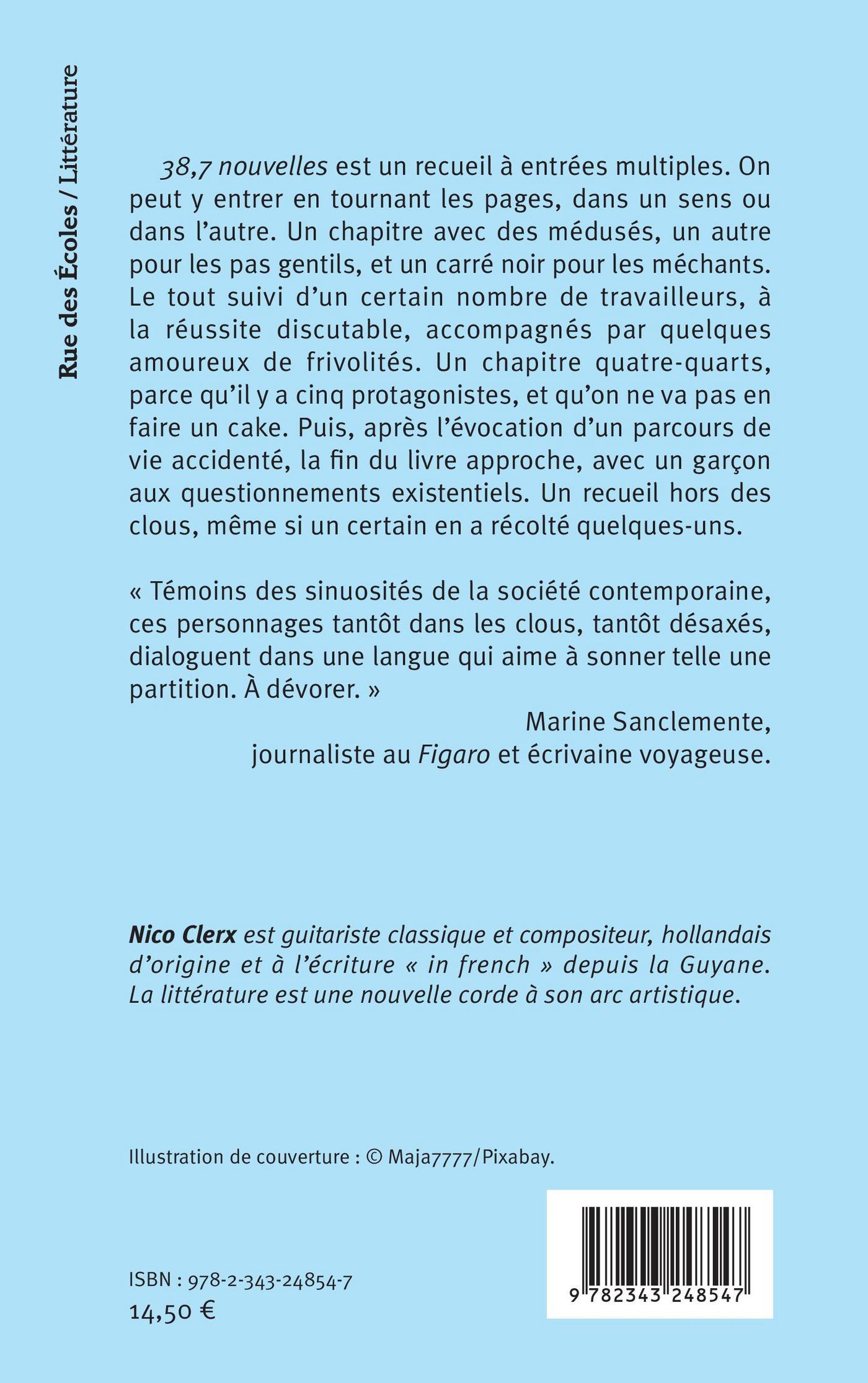 38,7 nouvelles est un recueil à entrées multiples. On peut y entrer en tournant les pages, dans un sens ou dans l'autre. Un chapitre avec des médusés, un autre pour les pas gentils, et un carré noir pour les méchants. Le tout suivi d'un certain nombre de travailleurs, à la réussite discutable, accompagnés par quelques amoureux de frivolités. Un chapitre quatre-quarts, parce qu'il y a cinq protagonistes, et qu'on ne va pas en faire un cake. Puis, après l'évocation d'un parcours de vie accidenté, la fin du livre approche, avec un garçon aux questionnements existentiels. Un recueil hors des clous, même si un certain en a récolté quelques-uns.« Témoins des sinuosités de la société contemporaine, ces personnages tantôt dans les clous, tantôt désaxés, dialoguent dans une langue qui aime à sonner telle une partition. À dévorer. » Marine Sanclemente, journaliste au Figaro et écrivaine voyageuse.