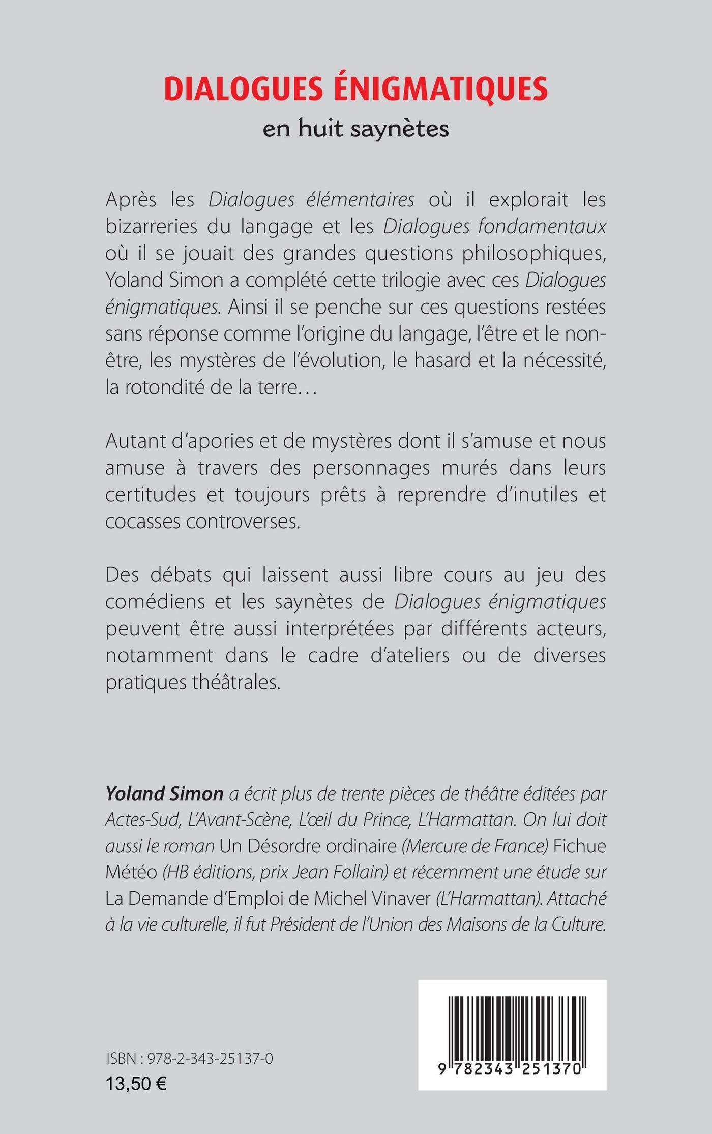 Après les Dialogues élémentaires où il explorait les bizarreries du langage et les Dialogues fondamentaux où il se jouait des grandes questions philosophiques, Yoland Simon a complété cette trilogie avec ces Dialogues énigmatiques. Ainsi il se penche sur ces questions restées sans réponse comme l’origine du langage, l’être et le non-être, les mystères de l’évolution, le hasard et la nécessité, la rotondité de la terre... Autant d’apories et de mystères dont il s’amuse et nous amuse à travers des personnages murés dans leurs certitudes et toujours prêts à reprendre d’inutiles et cocasses controverses. Des débats qui laissent aussi libre cours au jeu des comédiens et les saynètes de Dialogues énigmatiques peuvent être aussi interprétées par différents acteurs, notamment dans le cadre d’ateliers ou de diverses pratiques théâtrales.