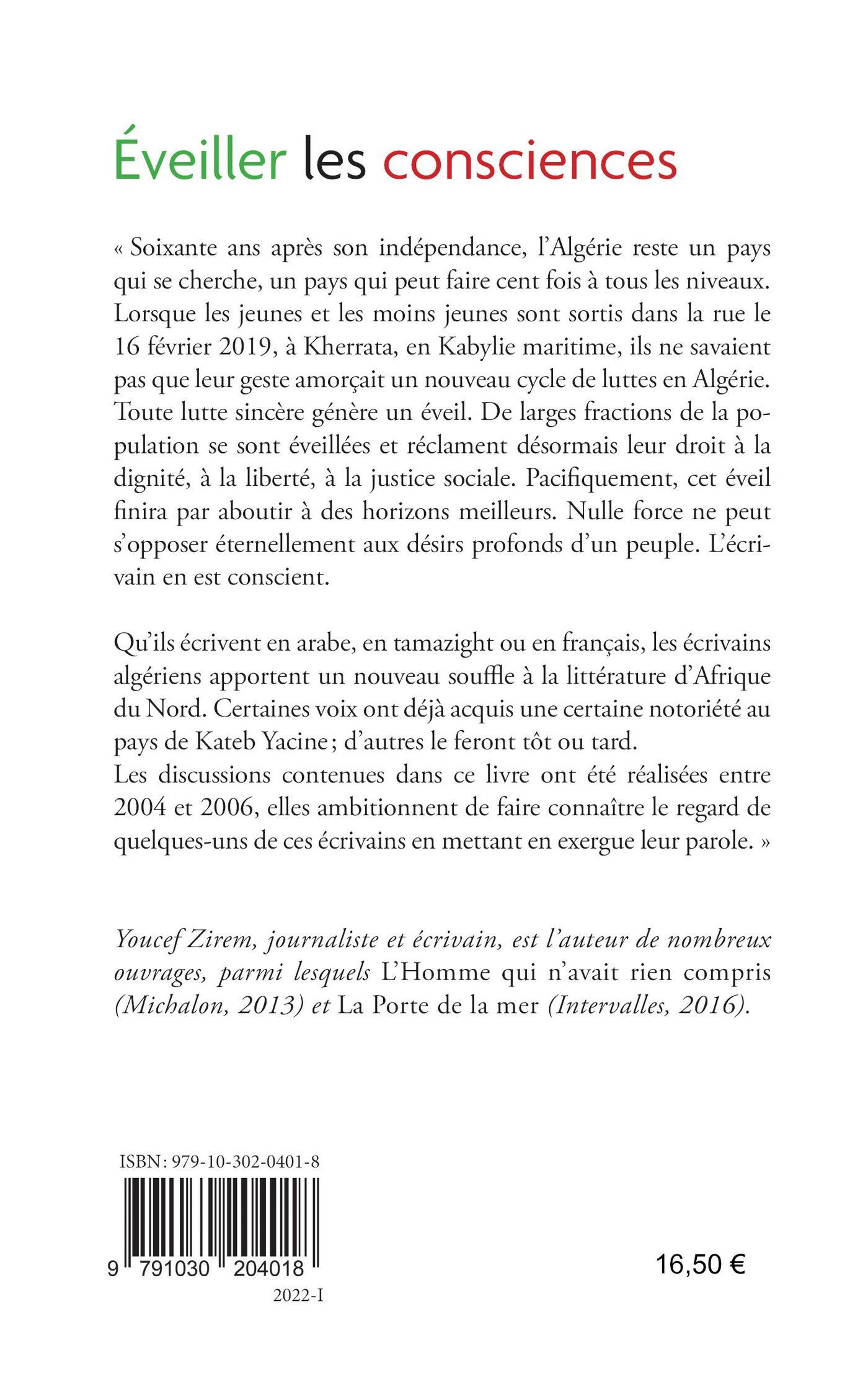 « Soixante ans après son indépendance, l'Algérie reste un pays qui se cherche, un pays qui peut faire cent fois à tous les niveaux. Lorsque les jeunes et les moins jeunes sont sortis dans la rue le 16 février 2019, à Kherrata, en Kabylie maritime, ils ne savaient pas que leur geste amorçait un nouveau cycle de luttes en Algérie. Toute lutte sincère génère un éveil. De larges fractions de la po- pulation se sont éveillées et réclament désormais leur droit à la dignité, à la liberté, à la justice sociale. Pacifiquement, cet éveil finira par aboutir à des horizons meilleurs. Nulle force ne peut s’opposer éternellement aux désirs profonds d’un peuple. L'écrivain en est conscient.Qu’ils écrivent en arabe, en tamazight ou en français, les écrivains algériens apportent un nouveau souffle à la littérature d’Afrique du Nord. Certaines voix ont déjà acquis une certaine notoriété au pays de Kateb Yacine ; d’autres le feront tôt ou tard.Les discussions contenues dans ce livre ont été réalisés entre 2004 et 2006, elles ambitionnent de faire connaître le regard de quelques-uns de ces écrivains en mettant en exergue leur parole. »