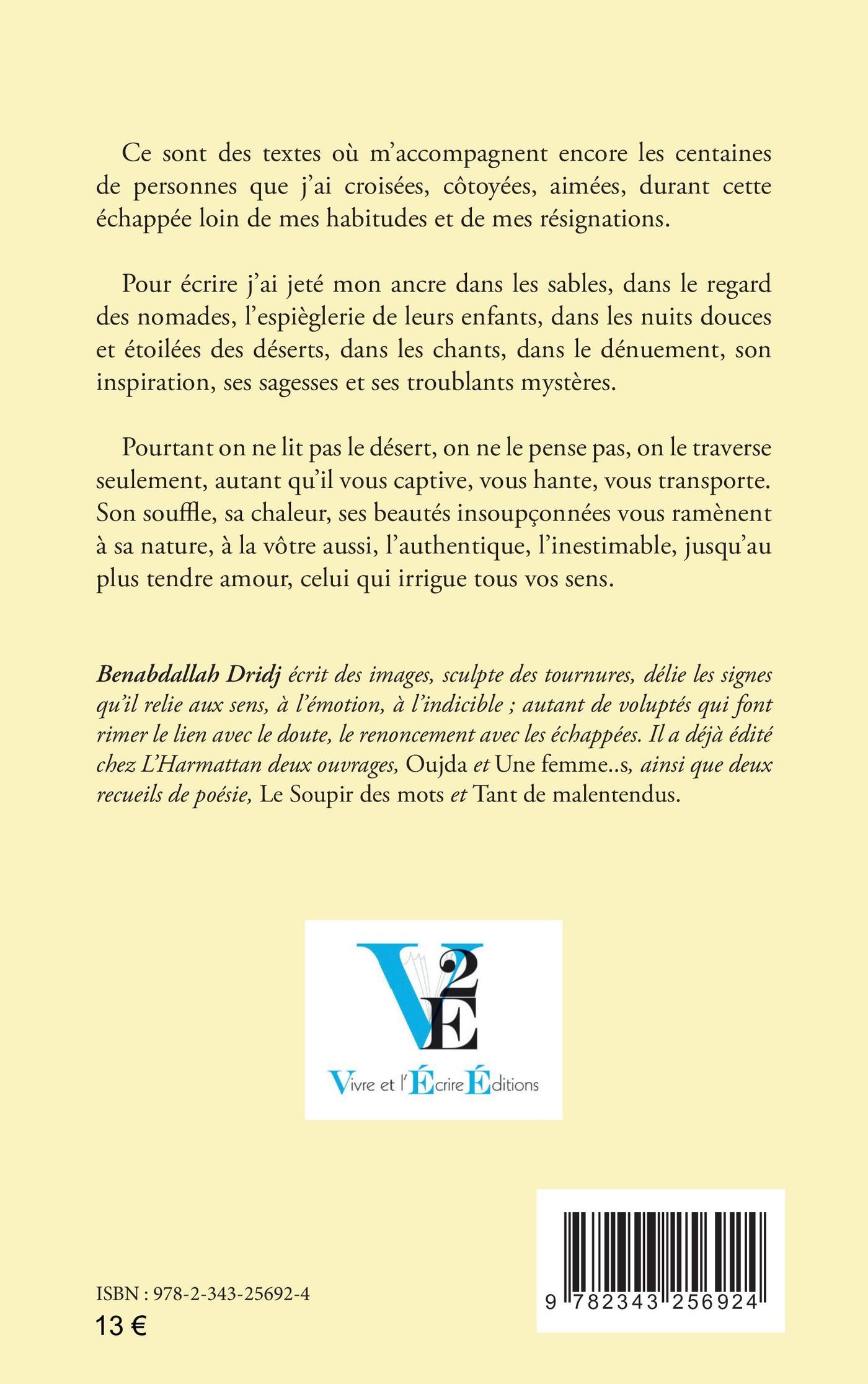 Ce sont des textes où m’accompagnent encore les centaines de personnes que j’ai croisées, côtoyées, aimées, durant cette échappée loin de mes habitudes et de mes résignations.Pour écrire j’ai jeté mon ancre dans les sables, dans le regard des nomades, l’espièglerie de leurs enfants, dans les nuits douces et étoilées des déserts, dans les chants, dans le dénuement, son inspiration, ses sagesses et ses troublants mystères.Pourtant on ne lit pas le désert, on ne le pense pas, on le traverse seulement, autant qu’il vous captive, vous hante, vous transporte. Son souffle, sa chaleur, ses beautés insoupçonnées vous ramènent à sa nature, à la vôtre aussi, l’authentique, l’inestimable, jusqu’au plus tendre amour, celui qui irrigue tous vos sens.