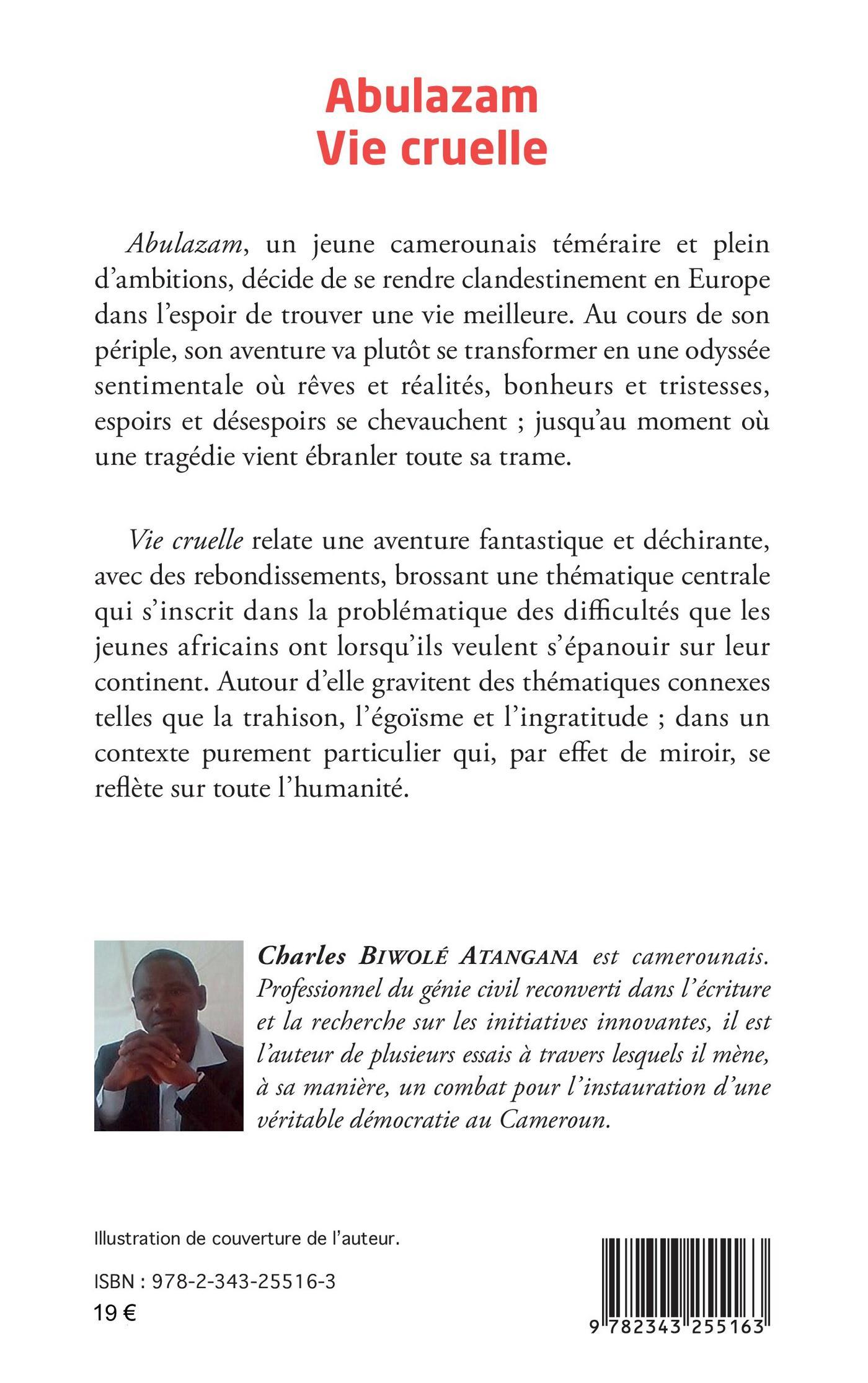 Abulazam, un jeune camerounais téméraire et plein d’ambitions, décide de se rendre clandestinement en Europe dans l’espoir de trouver une vie meilleure. Au cours de son périple, son aventure va plutôt se transformer en une odyssée sentimentale où rêves et réalités, bonheurs et tristesses, espoirs et désespoirs se chevauchent ; jusqu’au moment où une tragédie vient ébranler toute sa trame. Ce roman relate une aventure fantastique et déchirante, avec des rebondissements, brossant une thématique centrale qui s’inscrit dans la problématique des difficultés que les jeunes africains ont lorsqu’ils veulent s’épanouir sur leur continent.