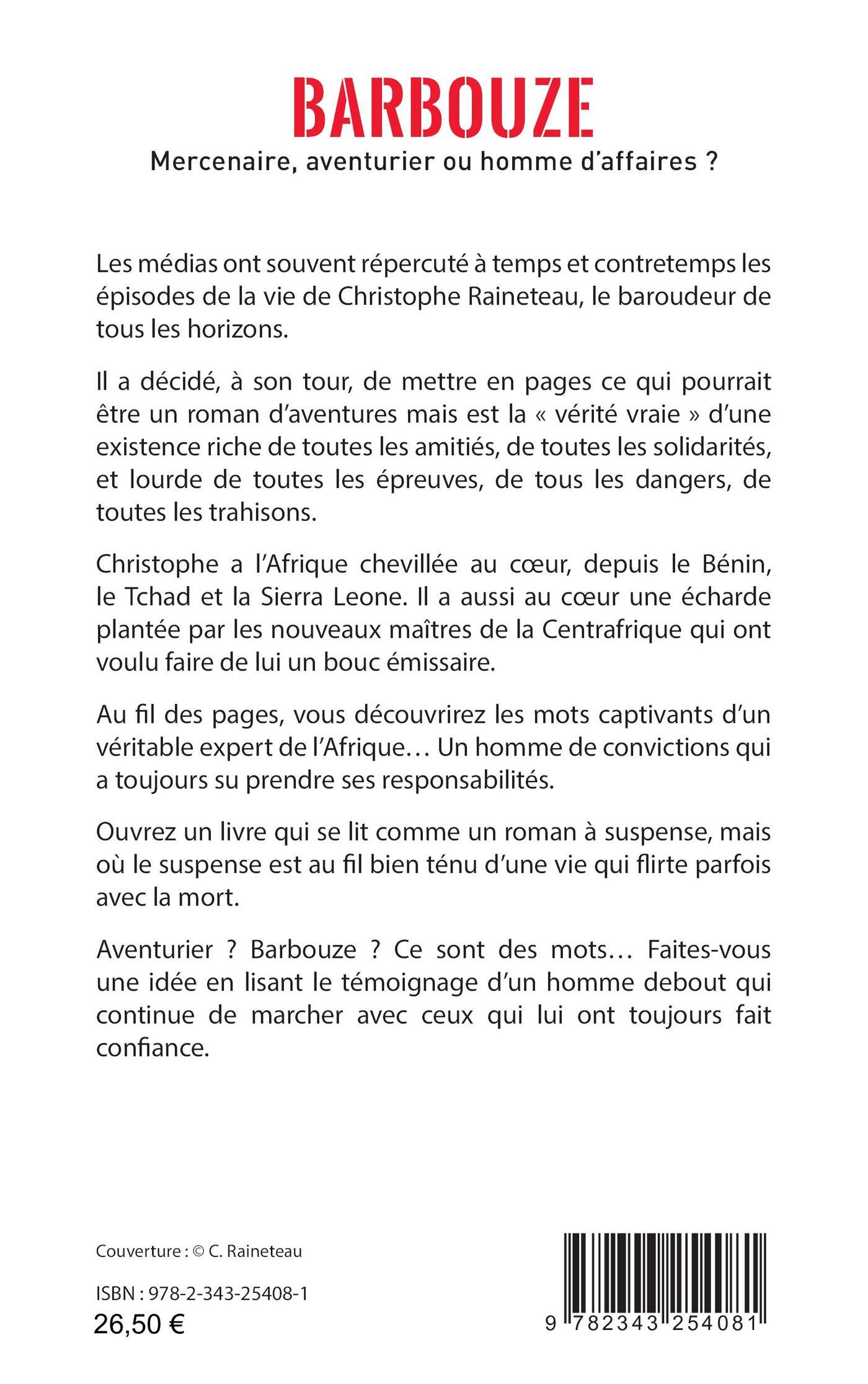 Les médias ont souvent répercuté à temps et contretemps les épisodes de la vie de Christophe Raineteau, le baroudeur de tous les horizons. Il a décidé, à son tour, de mettre en pages ce qui pourrait être un roman d’aventures mais est la « vérité vraie » d’une existence riche de toutes les amitiés, de toutes les solidarités, et lourde de toutes les épreuves, de tous les dangers, de toutes les trahisons. Christophe a l’Afrique chevillée au coeur, depuis le Bénin, le Tchad et la Sierra Leone. Il a aussi au coeur une écharde plantée par les nouveaux maîtres de la Centrafrique qui ont voulu faire de lui un bouc émissaire. Au fil des pages, vous découvrirez les mots captivants d’un véritable expert de l’Afrique... Un homme de convictions qui a toujours su prendre ses responsabilités.
