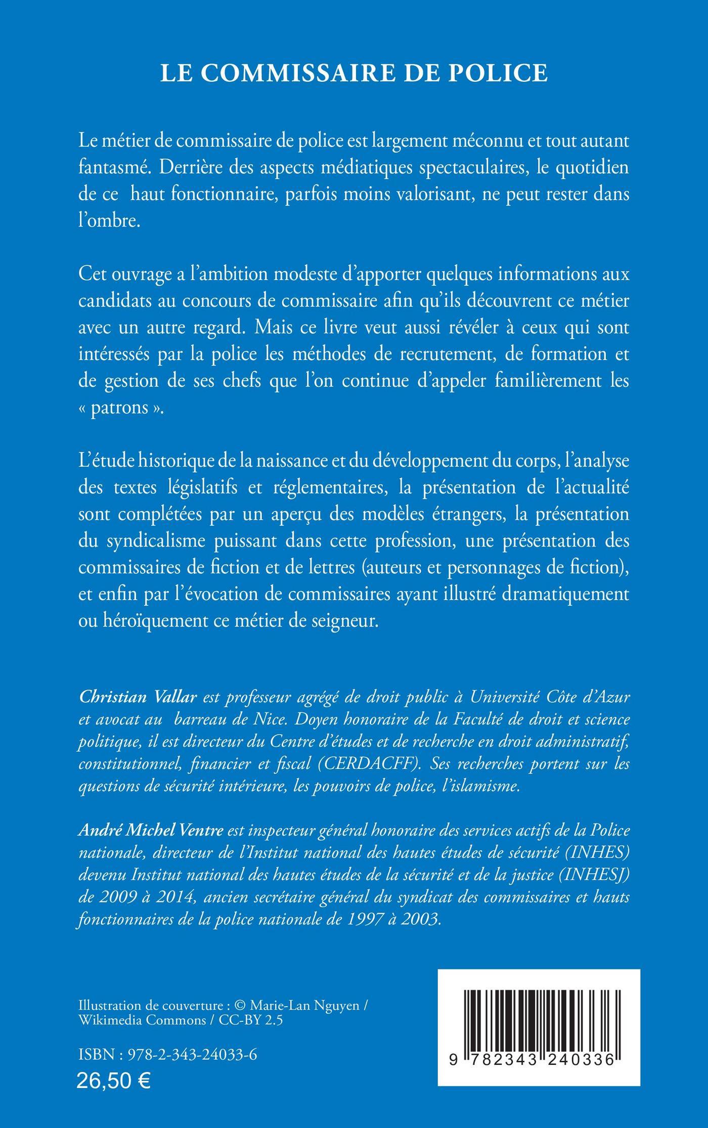 Le métier de commissaire de police est largement méconnu et tout autant fantasmé. Derrière des aspects médiatiques spectaculaires, le quotidien de ce haut fonctionnaire, parfois moins valorisant, ne peut rester dans l’ombre. Cet ouvrage a l’ambition modeste d’apporter quelques informations aux candidats au concours de commissaire afin qu’ils découvrent ce métier avec un autre regard. Mais ce livre veut aussi révéler à ceux qui sont intéressés par la police les méthodes de recrutement, de formation et de gestion de ses chefs que l’on continue d’appeler familièrement les « patrons ». L’étude historique de la naissance et du développement du corps, l’analyse des textes législatifs et réglementaires, la présentation de l’actualité sont complétées par un aperçu des modèles étrangers, la présentation du syndicalisme puissant dans cette profession, une présentation des commissaires de fiction et de lettres (auteurs et personnages de fiction), et enfin par l’évocation de commissaires ayant illustré dramatiquement ou héroïquement ce métier de seigneur.
