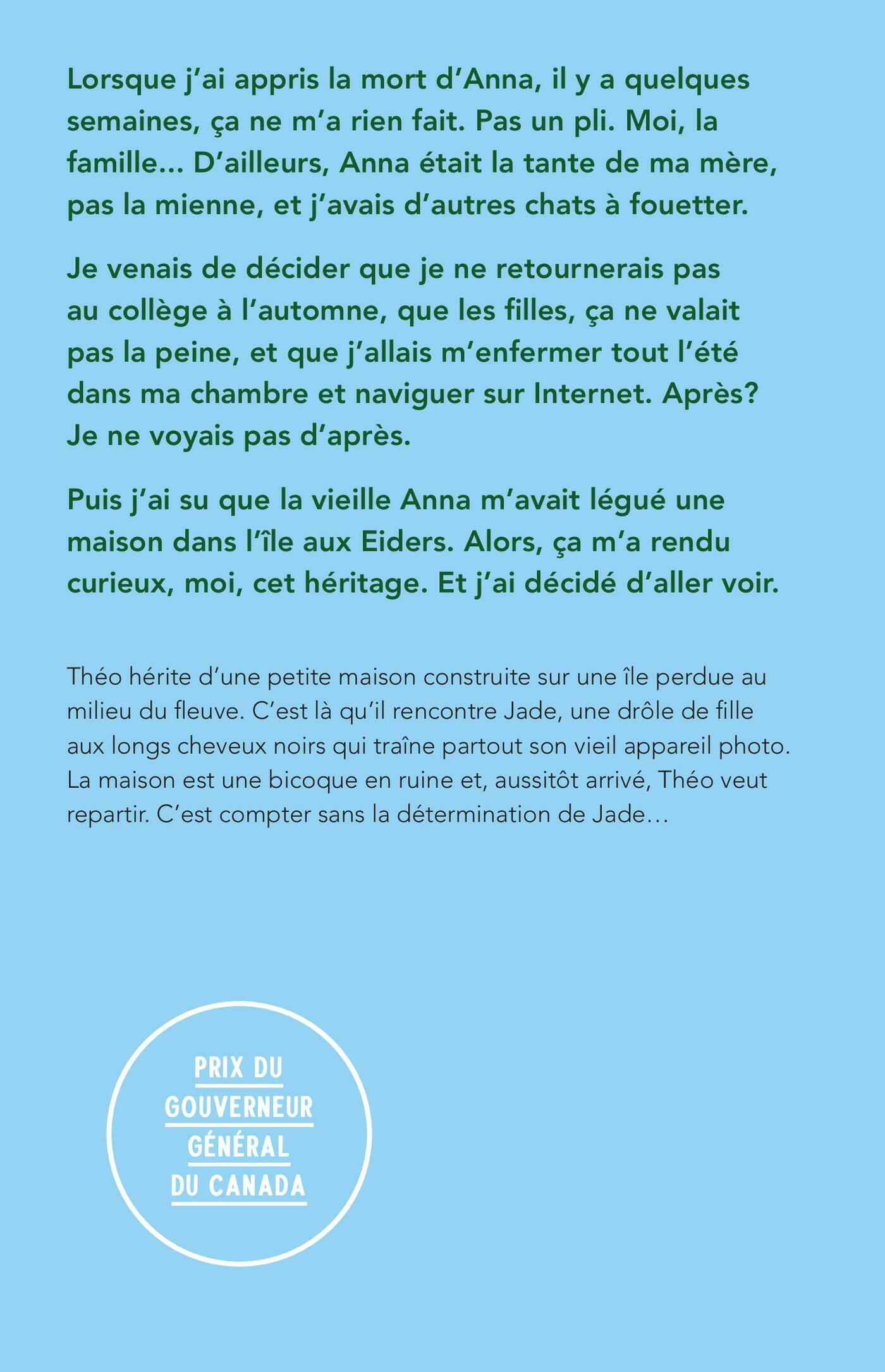 Théo, 17 ans, hérite d'une tante qu'il ne connaît pas une petite maison construite sur une île perdue au milieu du fleuve. La maison est une bicoque en ruine et, aussitôt arrivé, Théo veut repartir. Tout près de la nature, de la simplicité des gens qui habitent l'île, il viendra pourtant à voir la vie d'un tout autre regard. Et puis... ce sera l'été de Jade, l'été de l'amour. Un roman touchant, une ode à l'essentiel et à l'ouverture aux autres.