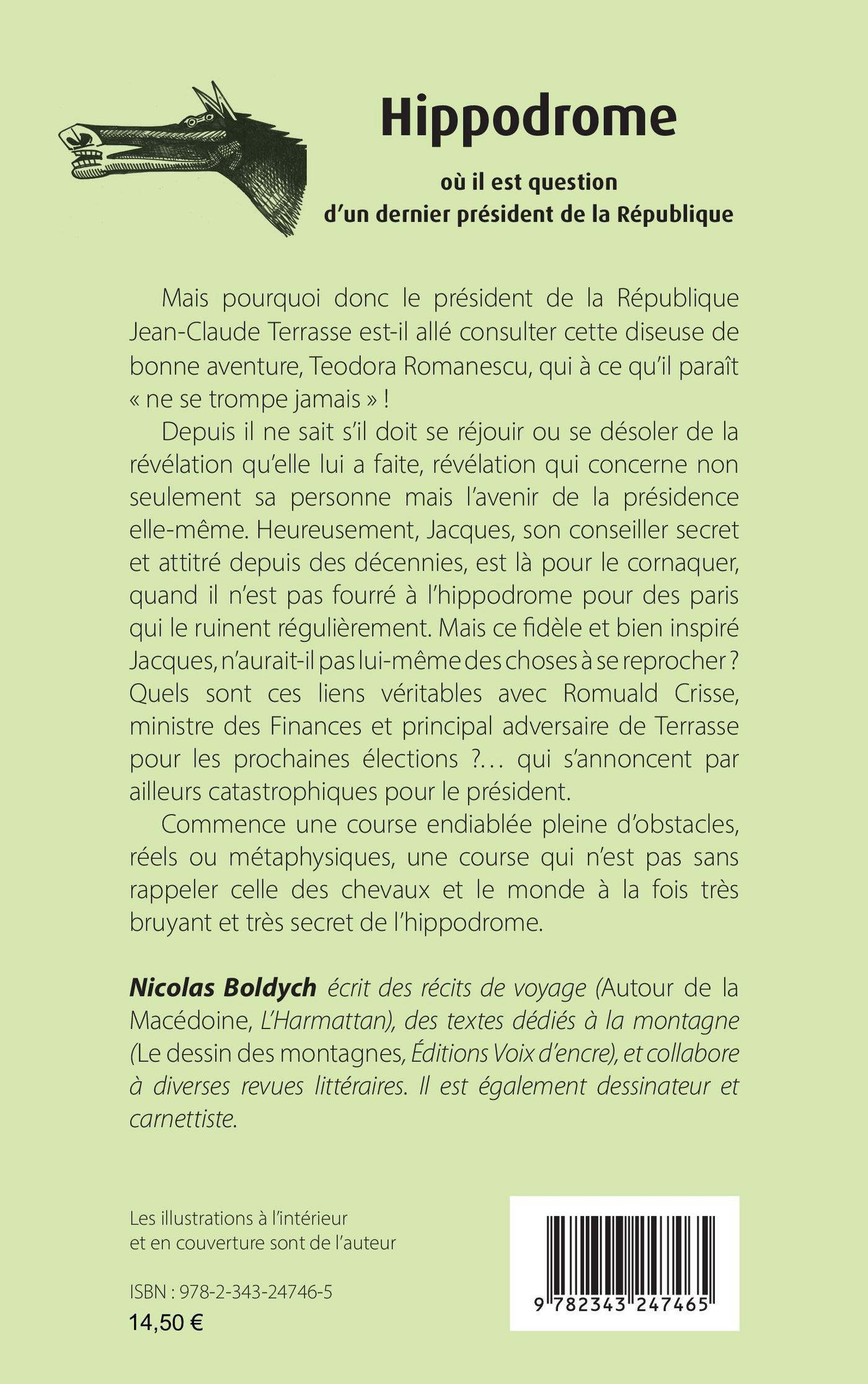 Mais pourquoi donc le président de la République Jean-Claude Terrasse est-il allé consulter cette diseuse de bonne aventure, Teodora Romanescu, qui à ce qu’il paraît « ne se trompe jamais » ! Depuis il ne sait s’il doit se réjouir ou se désoler de la révélation qu’elle lui a faite, révélation qui concerne non seulement sa personne mais l’avenir de la présidence elle-même. Heureusement, Jacques, son conseiller secret et attitré depuis des décennies, est là pour le cornaquer, quand il n’est pas fourré à l’hippodrome pour des paris qui le ruinent régulièrement. Commence une course endiablée pleine d’obstacles, réels ou métaphysiques, une course qui n’est pas sans rappeler celle des chevaux et le monde à la fois très bruyant et très secret de l’hippodrome.
