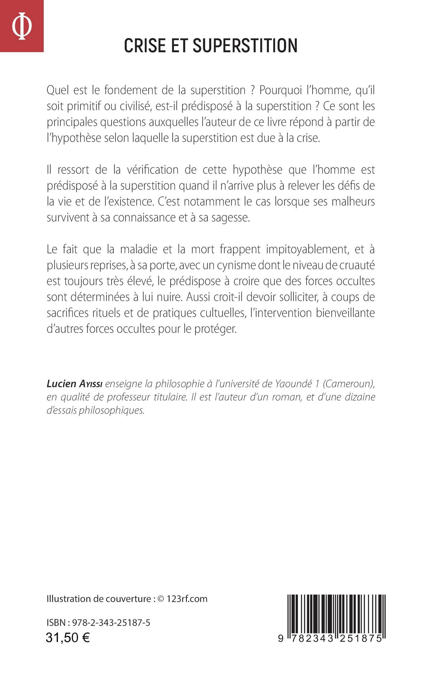Quel est le fondement de la superstition ? Pourquoi l’homme, qu’il soit primitif ou civilisé, est-il prédisposé à la superstition ? Ce sont les principales questions auxquelles l’auteur de ce livre répond à partir de l’hypothèse selon laquelle la superstition est due à la crise. Il ressort de la vérification de cette hypothèse que l’homme est prédisposé à la superstition quand il n’arrive plus à relever les défis de la vie et de l’existence. C’est notamment le cas lorsque ses malheurs survivent à sa connaissance et à sa sagesse. Le fait que la maladie et la mort frappent impitoyablement, et à plusieurs reprises, à sa porte, avec un cynisme dont le niveau de cruauté est toujours très élevé, le prédispose à croire que des forces occultes sont déterminées à lui nuire. Aussi croit-il devoir solliciter, à coups de sacrifices rituels et de pratiques cultuelles, l’intervention bienveillante d’autres forces occultes pour le protéger.