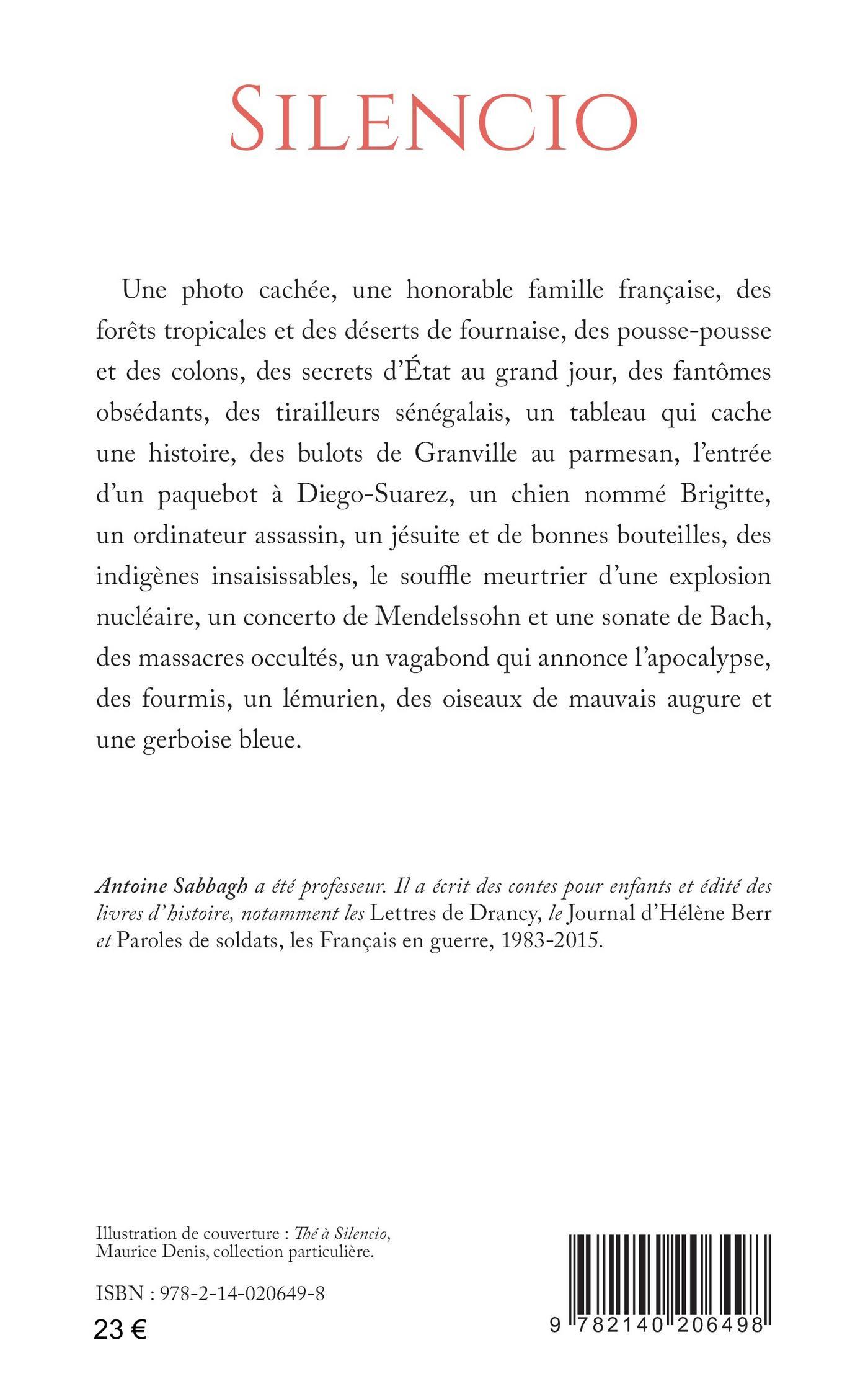 Une photo cachée, une honorable famille française, des forêts tropicales et des déserts de fournaise, des pousse-pousse et des colons, des secrets d’État au grand jour, des fantômes obsédants, des tirailleurs sénégalais, un tableau qui cache une histoire, des bulots de Granville au parmesan, l’entrée d’un paquebot à Diego-Suarez, un chien nommé Brigitte, un ordinateur assassin, un jésuite et de bonnes bouteilles, des indigènes insaisissables, le souffle meurtrier d’une explosion nucléaire, un concerto de Mendelssohn et une sonate de Bach, des massacres occultés, un vagabond qui annonce l’apocalypse, des fourmis, un lémurien, des oiseaux de mauvais augure et une gerboise bleue.