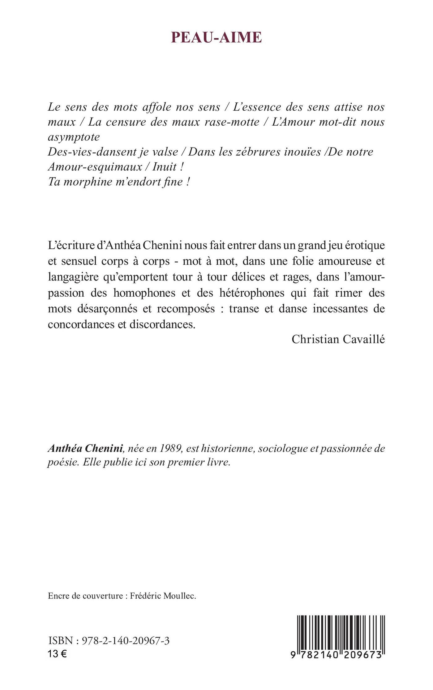 Le sens des mots affole nos sens / L’essence des sens attise nos maux / La censure des maux rase-motte / L’Amour mot-dit nous asymptoteDes-vies-dansent je valse / Dans les zébrures inouïes /De notre Amour-esquimaux / Inuit !Ta morphine m’endort fine !L’écriture d’Anthéa Chenini nous fait entrer dans un grand jeu érotique et sensuel corps à corps - mot à mot, dans une folie amoureuse et langagière qu’emportent tour à tour délices et rages, dans l’amour-passion des homophones et des hétérophones qui fait rimer des mots désarçonnés et recomposés : transe et danse incessantes de concordances et discordances. Christian Cavaillé