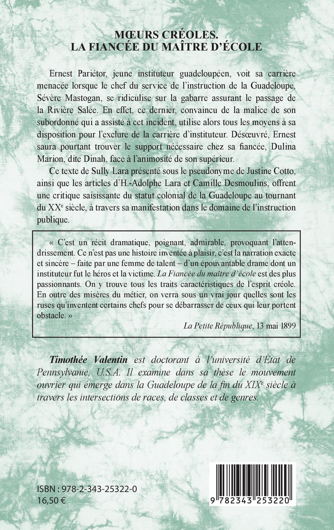 Ernest Pariétor, jeune instituteur guadeloupéen, voit sa carrière menacée lorsque le chef du service de l'instruction de la Guadeloupe, Sévère Mastogan, se ridiculise sur la gabarre assurant le passage de la Rivière Salée. En effet, ce dernier, convaincu de la malice de son subordonné qui a assisté à cet incident, utilise alors tous les moyens à sa disposition pour l'exclure de la carrière d'instituteur. Désoeuvré Ernest saura pourtant trouver le support nécessaire chez sa fiancée, Dulina Marion, dite Dinah, face à l'animosité de son supérieur. Ce texte de Sully Lara présenté sous le pseudonyme de Justine Cotto,ainsi que les articles d'H.- Adolphe Lara et Camille Desmoulins, offrent une critique saisissante du statut colonial de la Guadeloupe au tournant du XXe siècle, à travers sa manifestation dans le domaine de l'instruction publique.