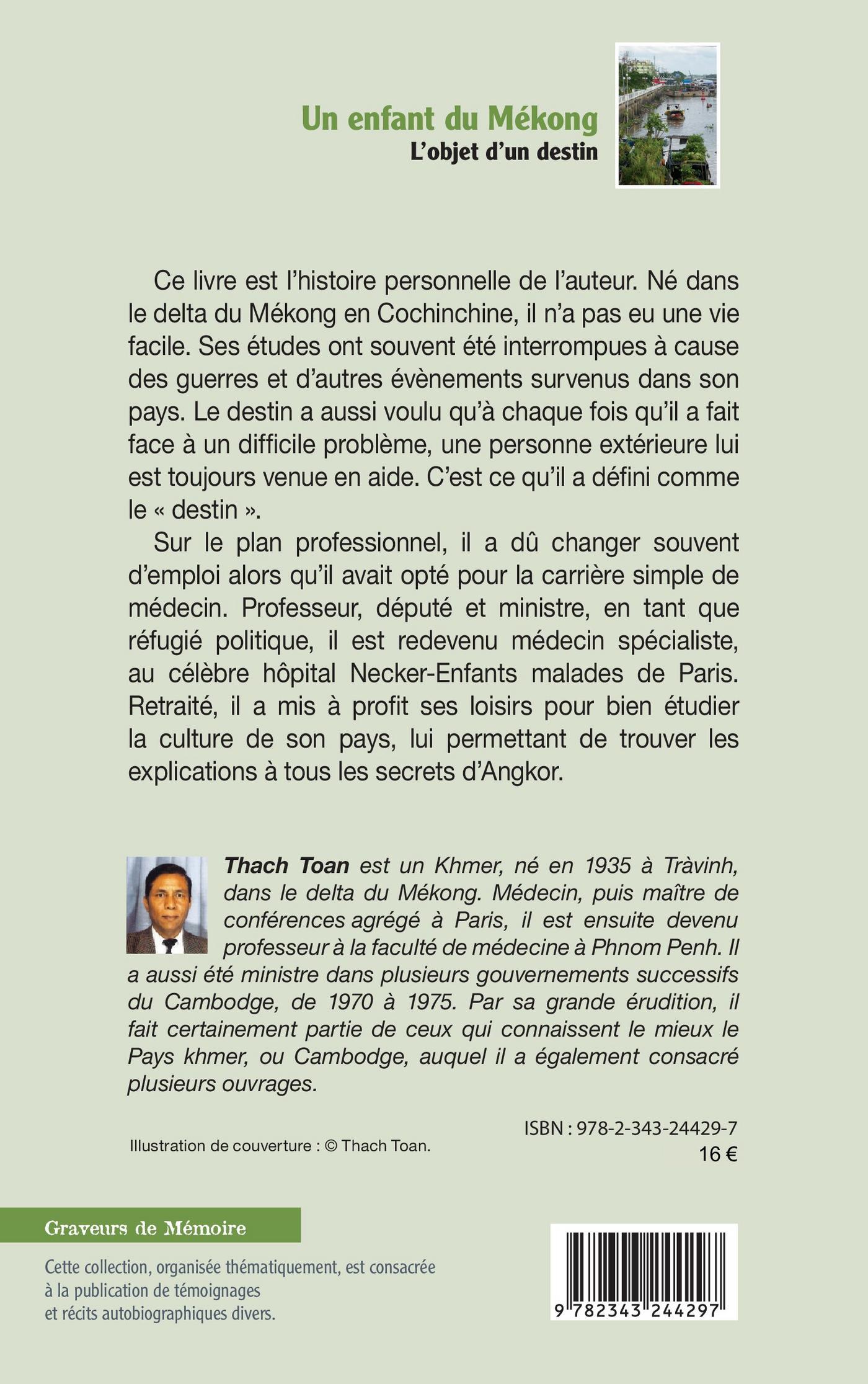 Ce livre est l’histoire personnelle de l’auteur. Né dans le delta du Mékong en Cochinchine, il n’a pas eu une vie facile. Ses études ont souvent été interrompues à cause des guerres et d’autres évènements survenus dans son pays. Le destin a aussi voulu qu’à chaque fois qu’il a fait face à un difficile problème, une personne extérieure lui est toujours venue en aide. C’est ce qu’il a défini comme le « destin ». Sur le plan professionnel, il a dû changer souvent d’emploi alors qu’il avait opté pour la carrière simple de médecin. Professeur, député et ministre, en tant que réfugié politique, il est redevenu médecin spécialiste, au célèbre hôpital Necker-Enfants malades de Paris. Retraité, il a mis à profit ses loisirs pour bien étudier la culture de son pays, lui permettant de trouver les explications à tous les secrets d’Angkor.